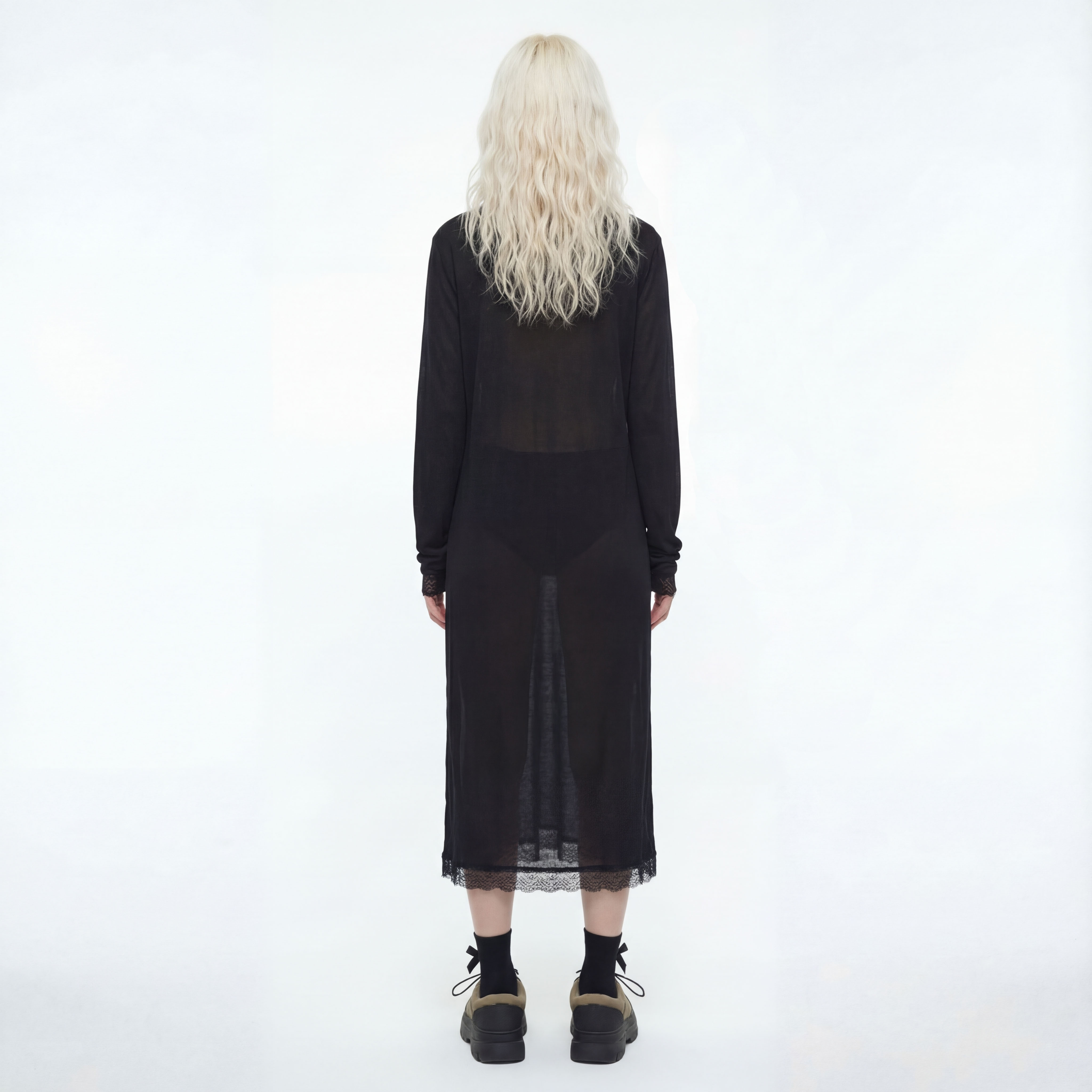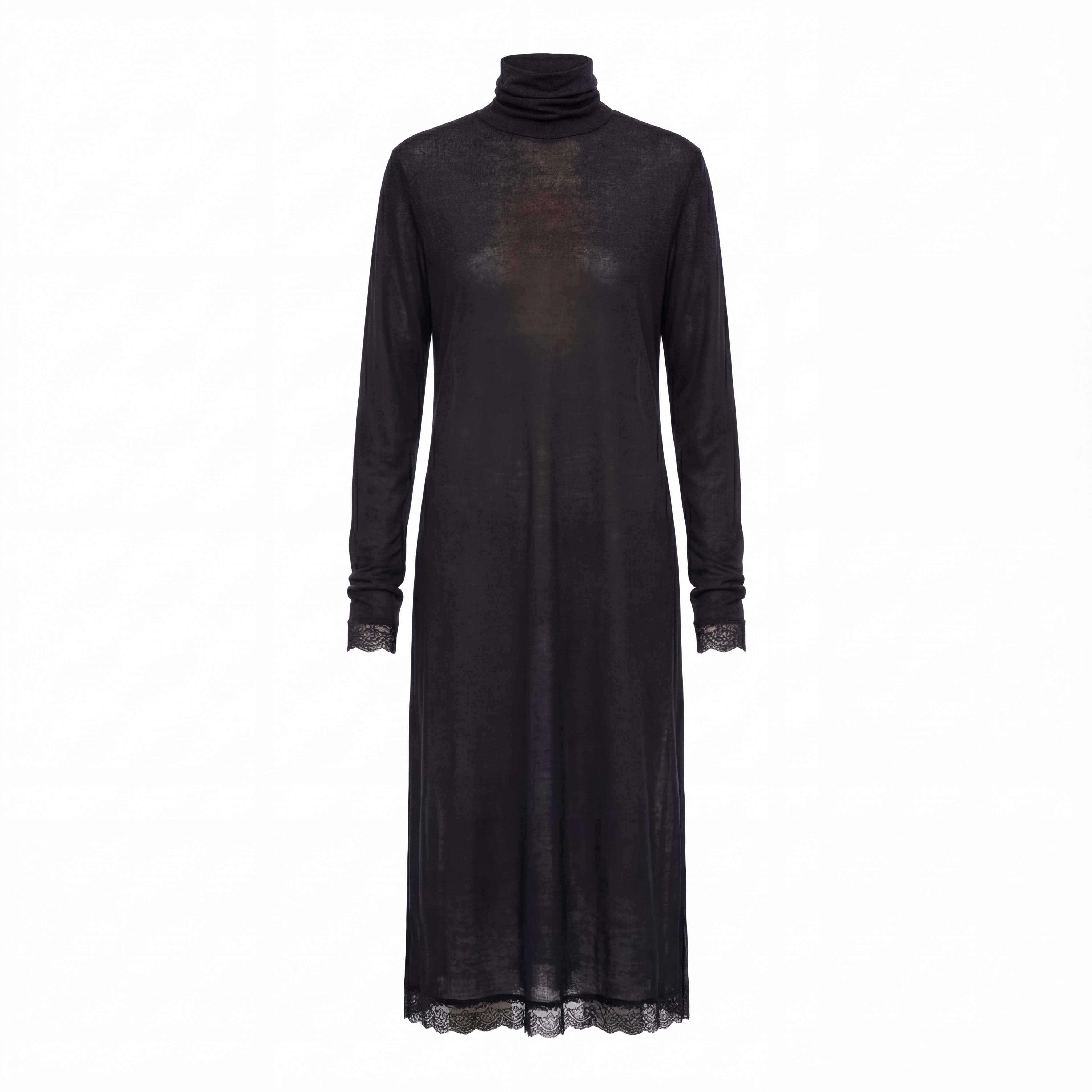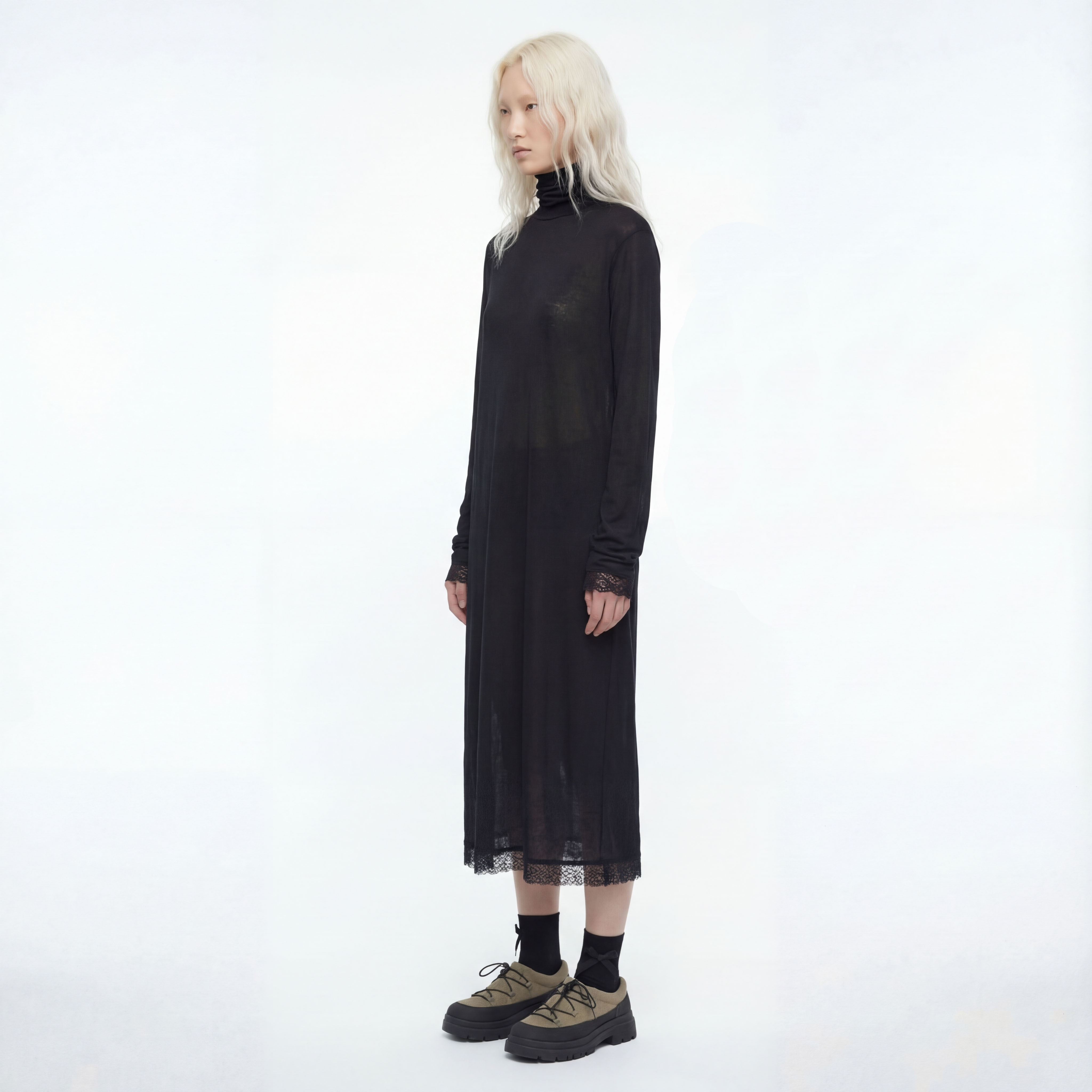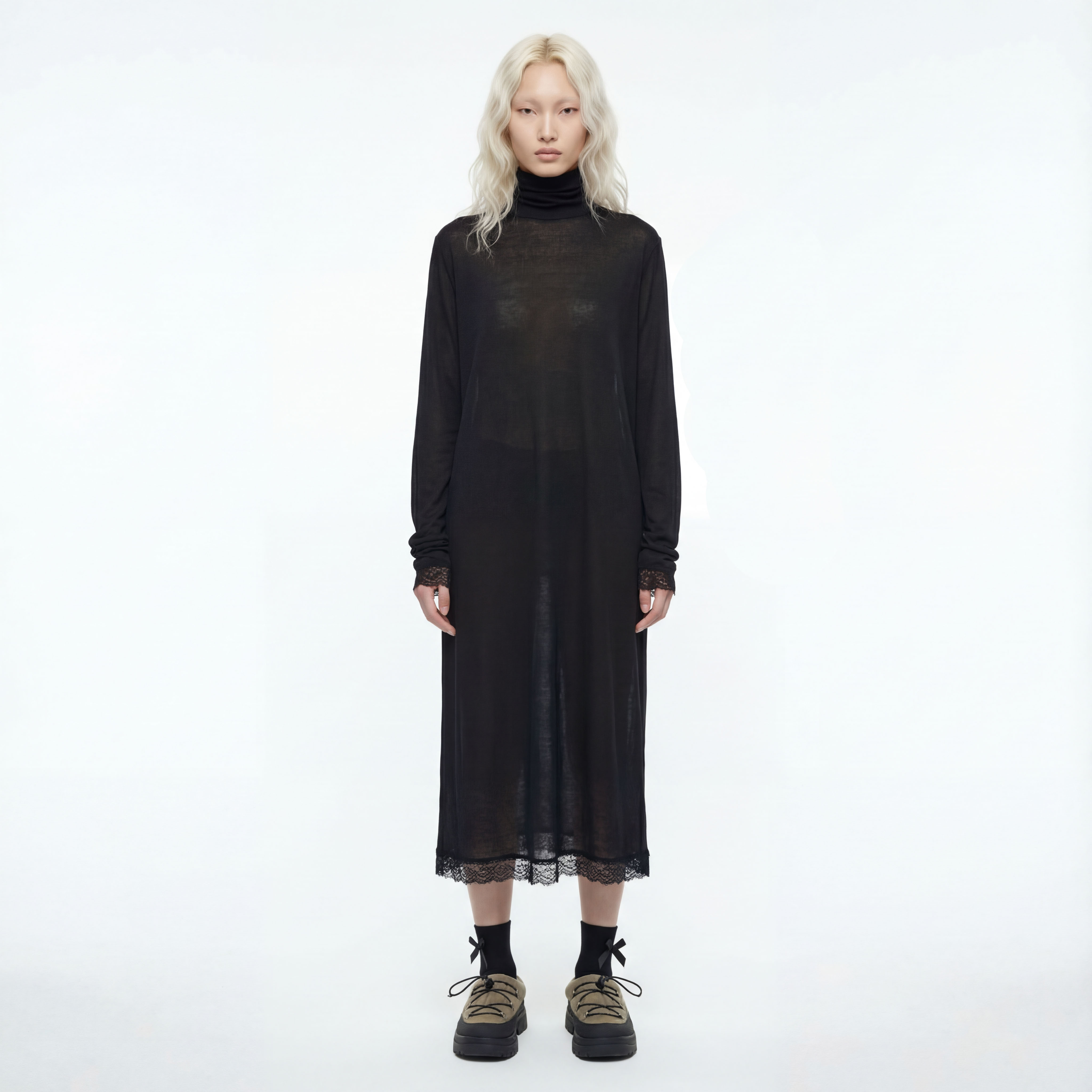 Элегантное платье из тонкого трикотажа с добавлением шёлка — минималистичный и в то же время очень женственный образ. Платье чёрного цвета с высоким воротником‑гольф, длинными узкими рукавами и прямым, слегка свободным силуэтом длиной миди. Ткань лёгкая и воздушная, красиво драпируется и слегка просвечивает, создавая нежную, утончённую фактуру. Акценты — деликатное кружево на манжетах и подоле, которое добавляет романтичности и изящности.