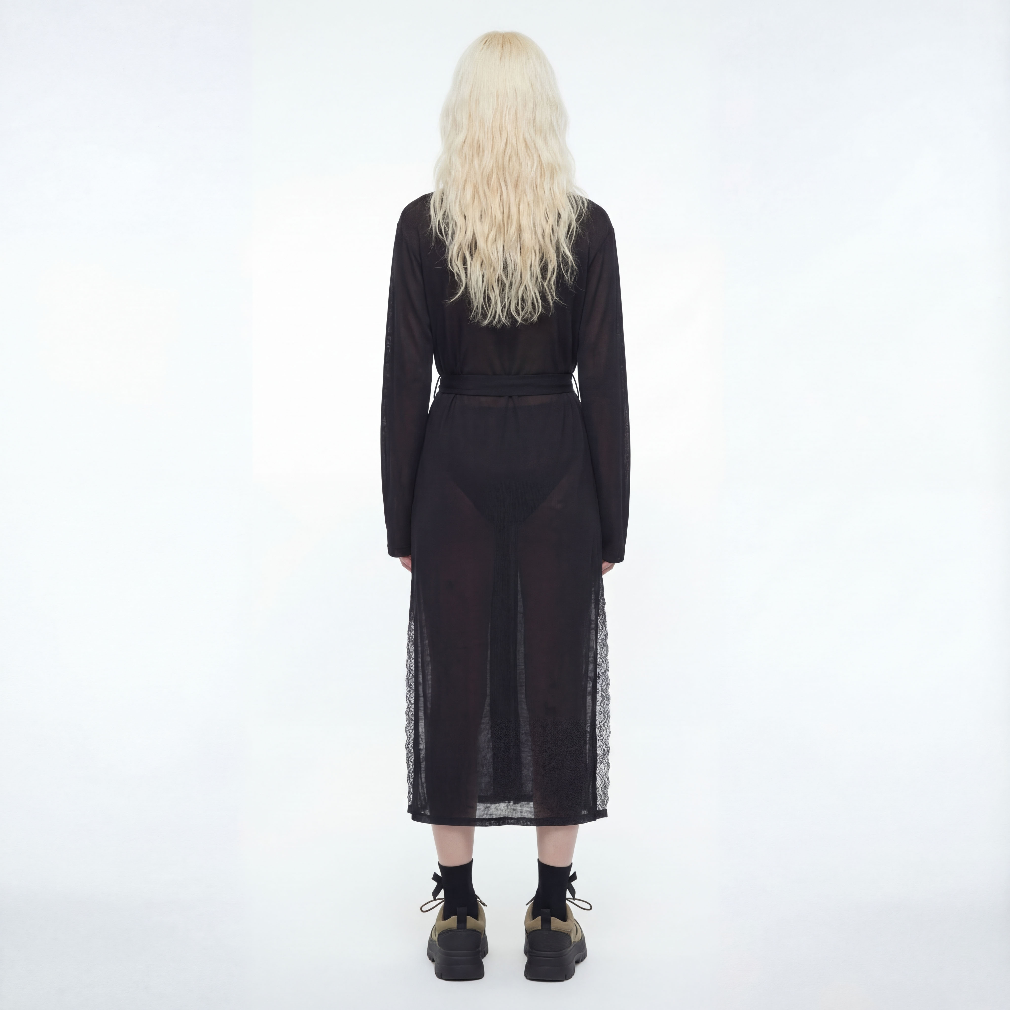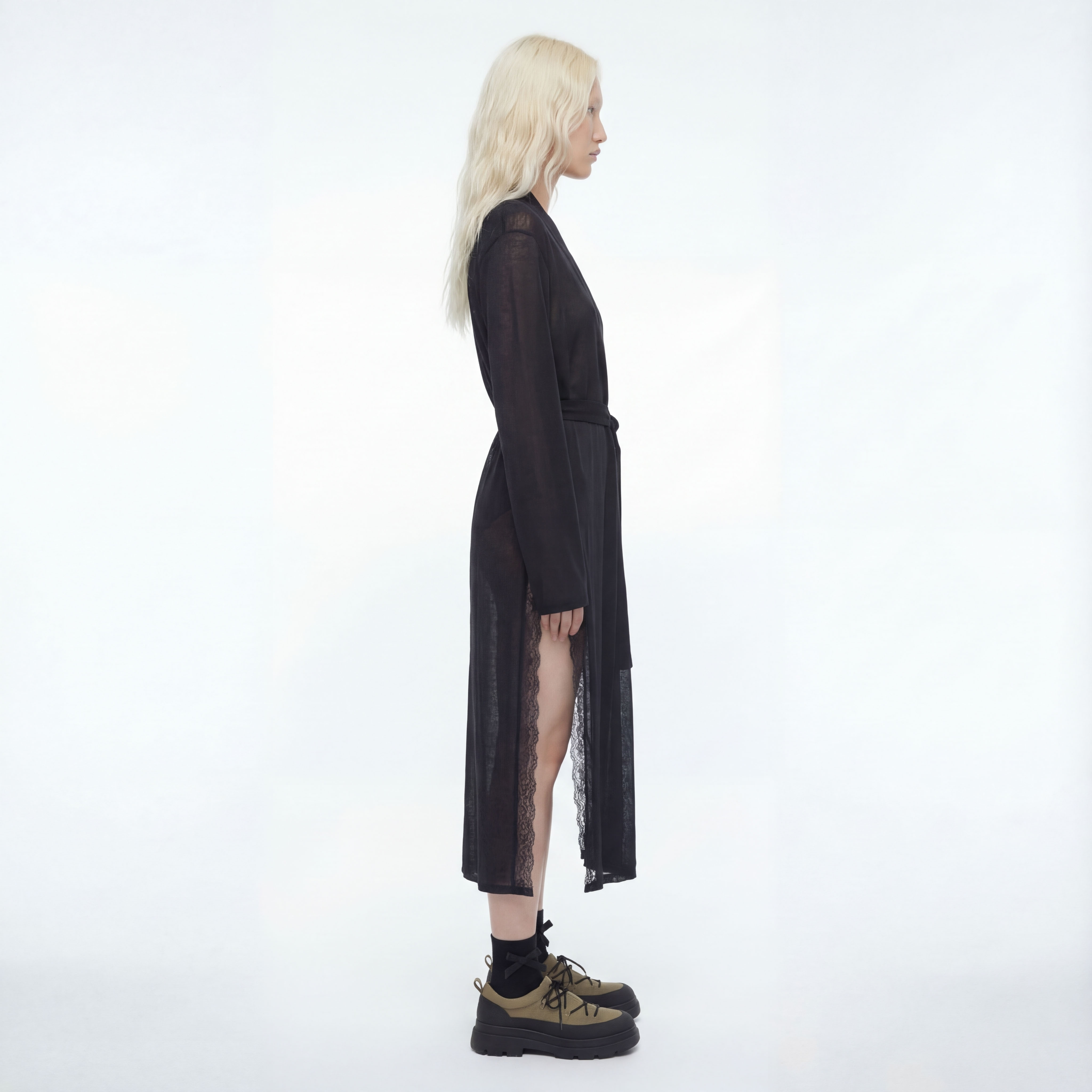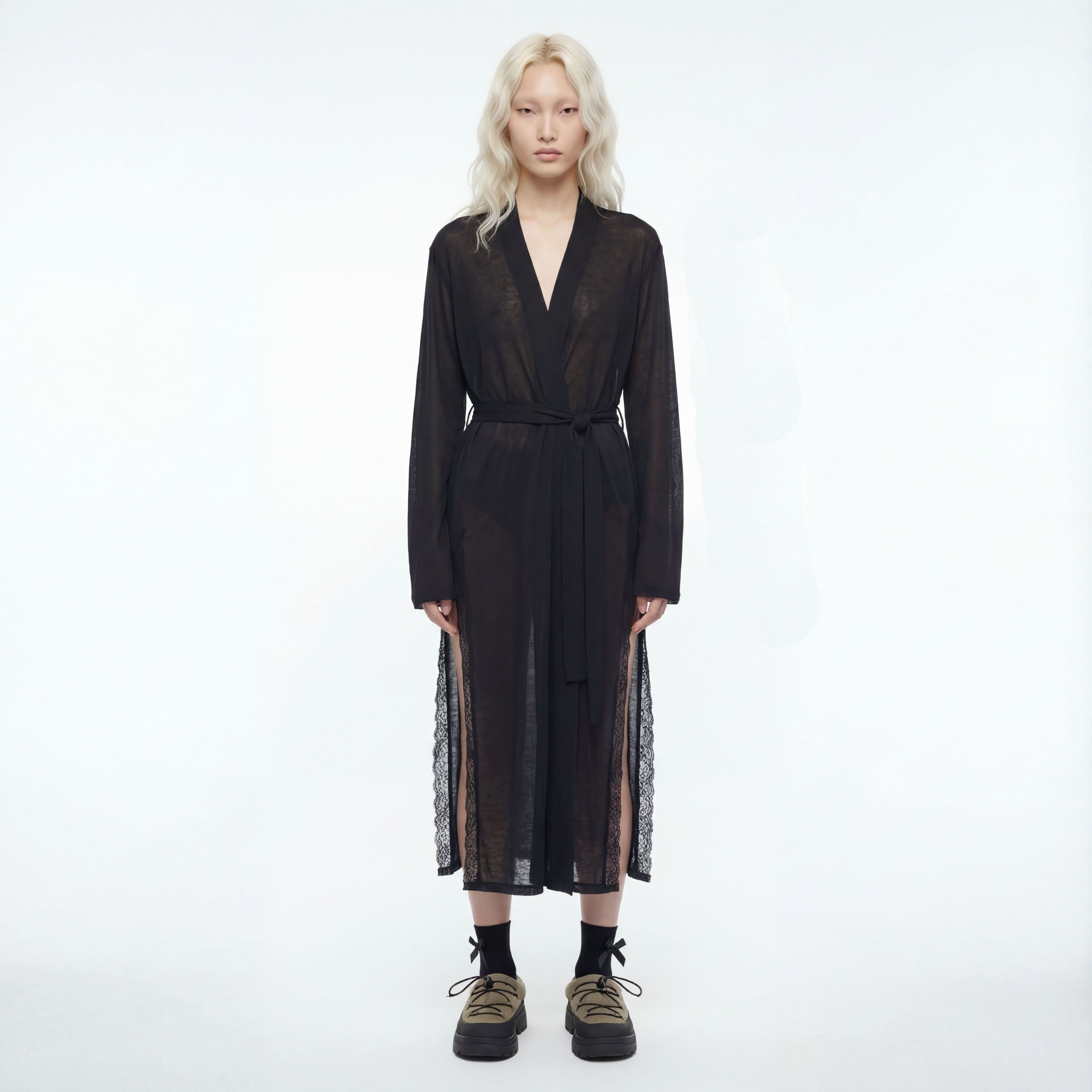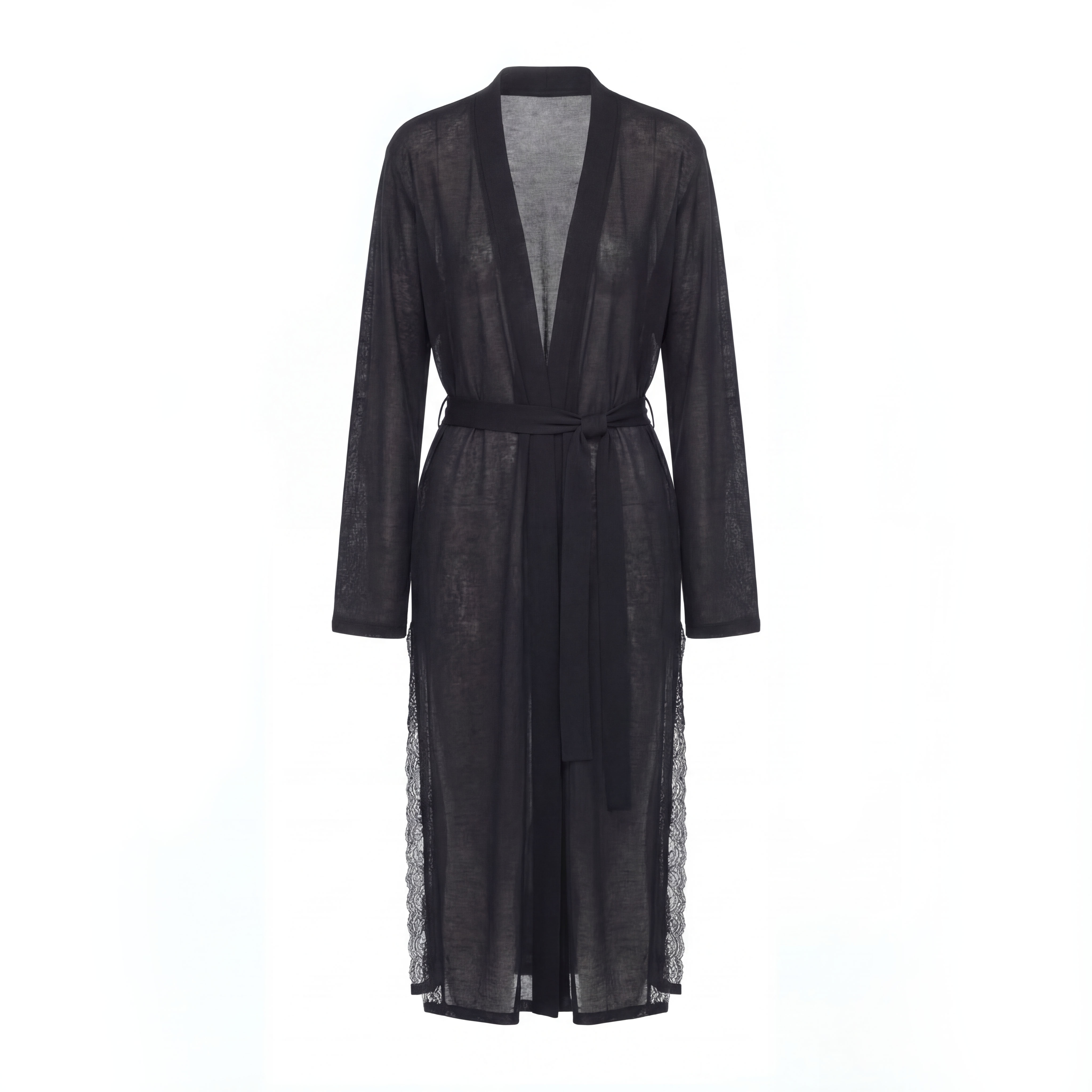 Элегантный удлинённый халат из лёгкого трикотажа с добавлением шёлка — глубокий чёрный, с тонким блеском, полупрозрачный, с поясом и кружевными боковыми вставками. Идеален как для домашнего уюта, так и для стильных образов в качестве накидки.