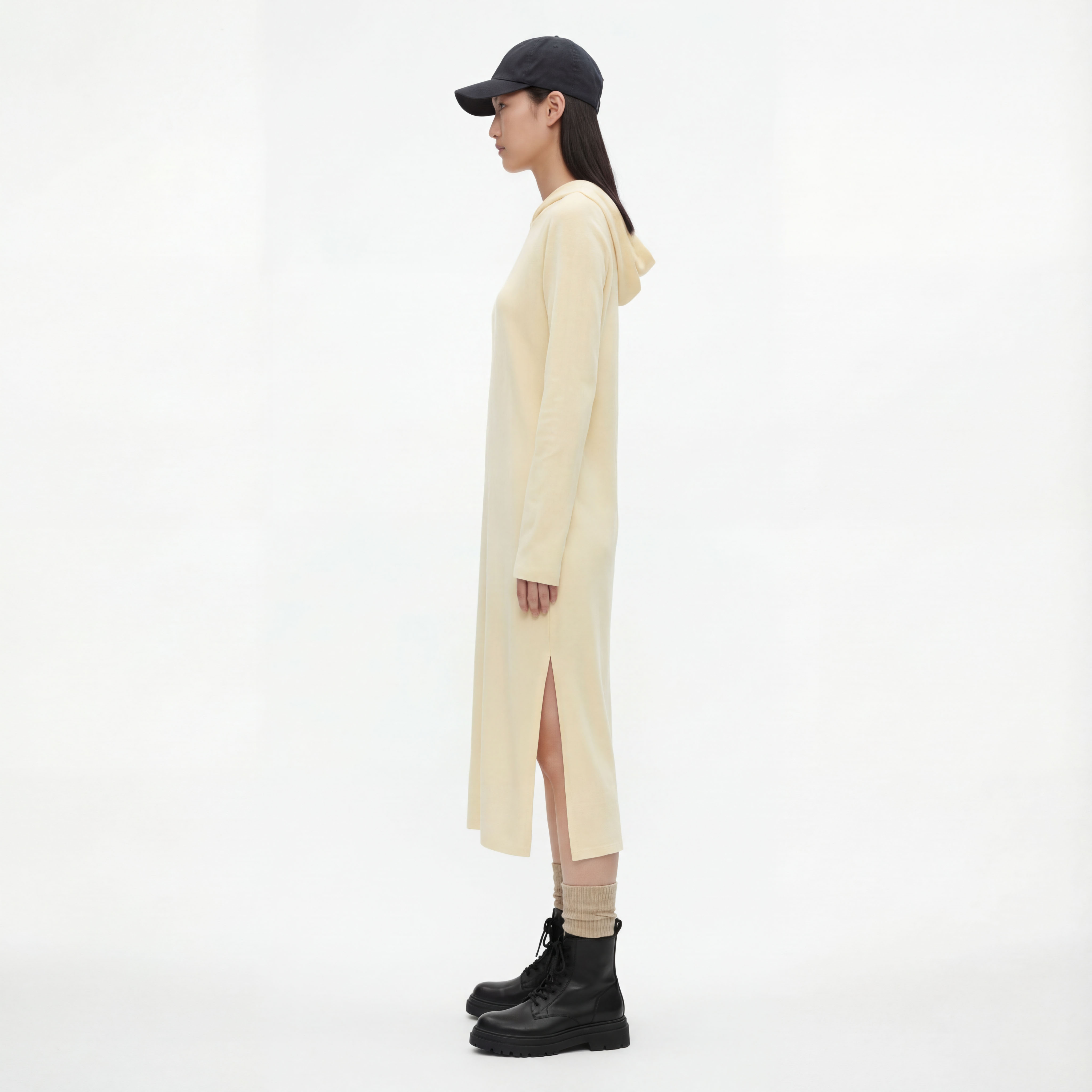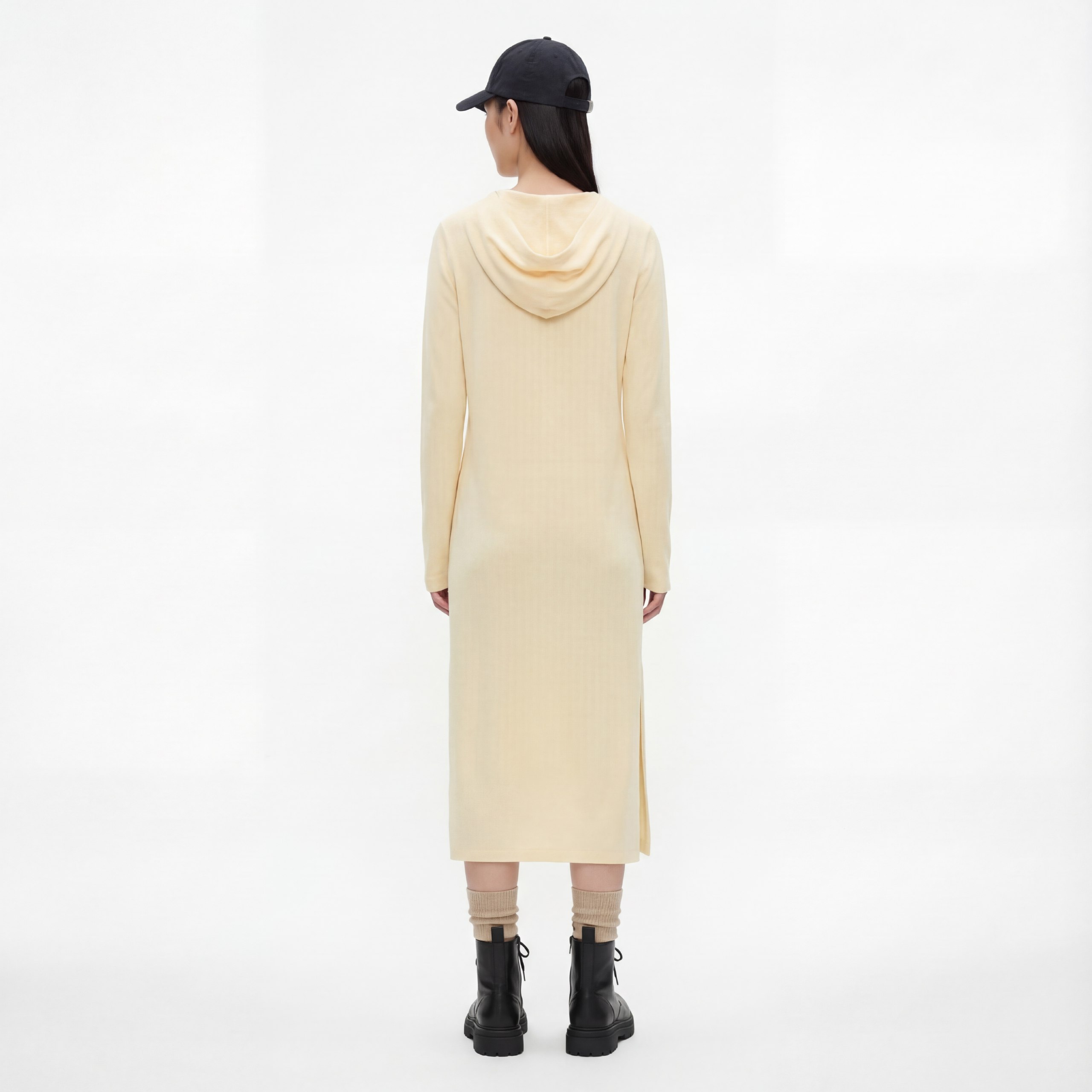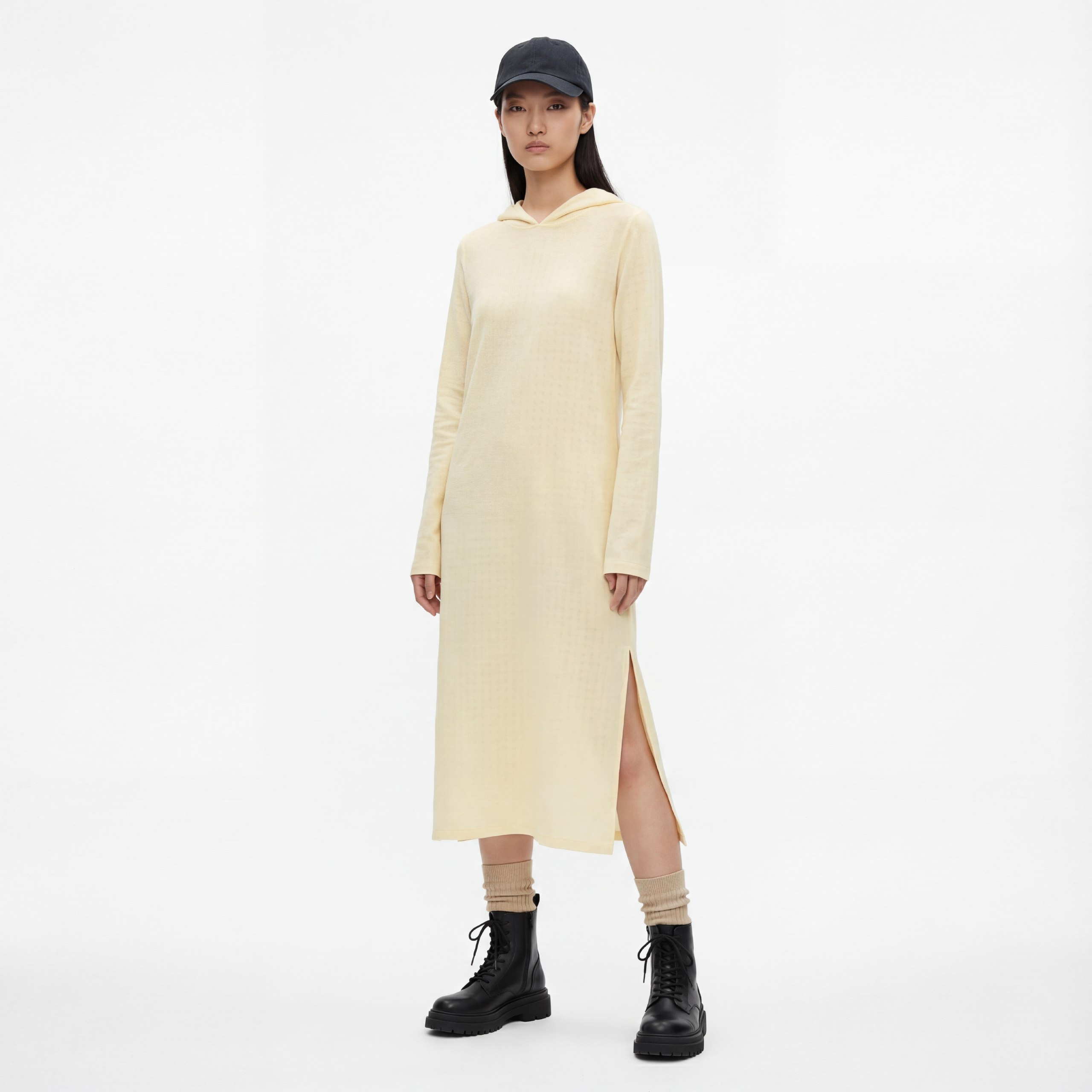 Платье-миди из плательной текстурированной шерсти, прямой силуэт с длинными рукавами и капюшоном, боковые разрезы. Мягкое, теплое и дышащее — идеальное для прохладной погоды. Цвет: сливочно‑бежевый.