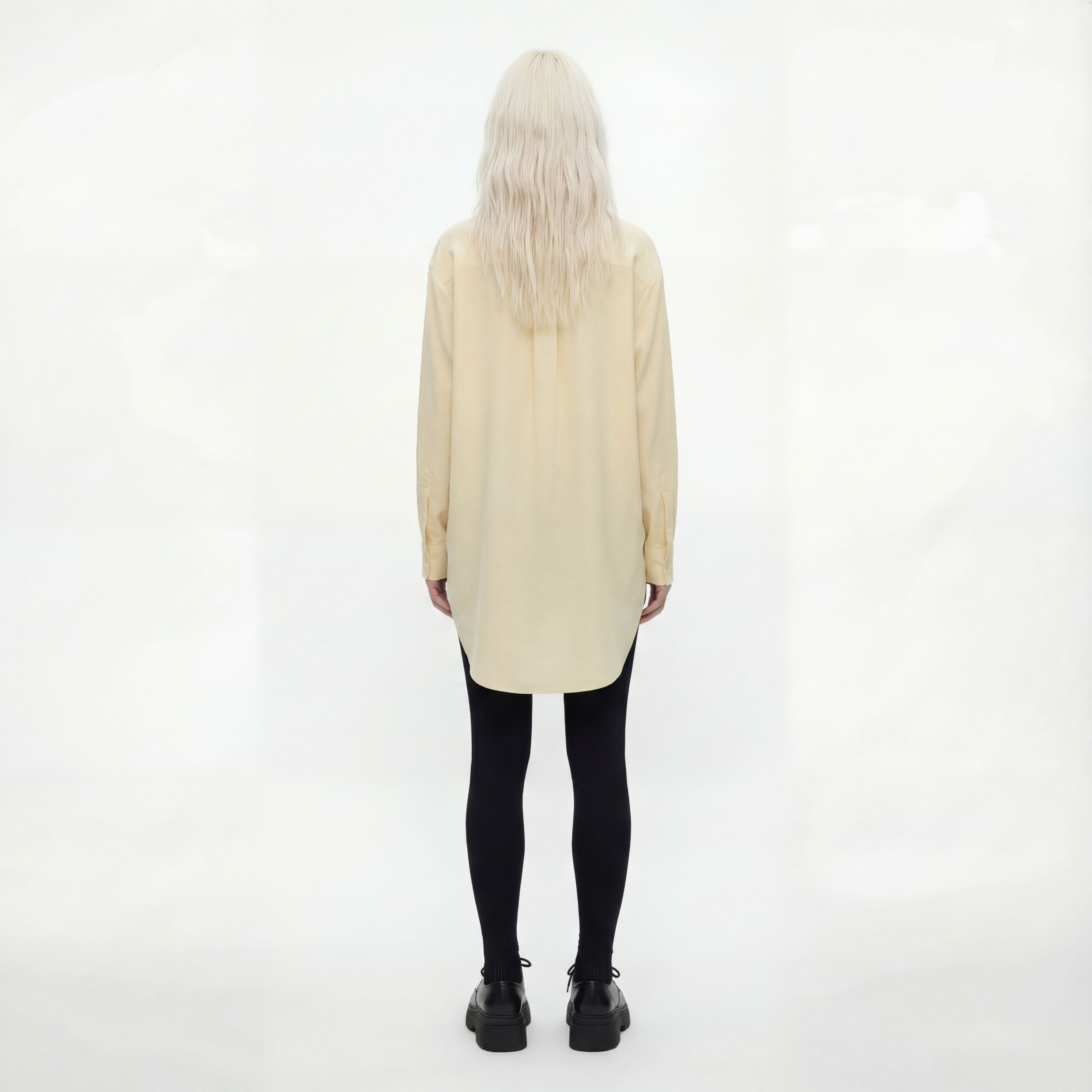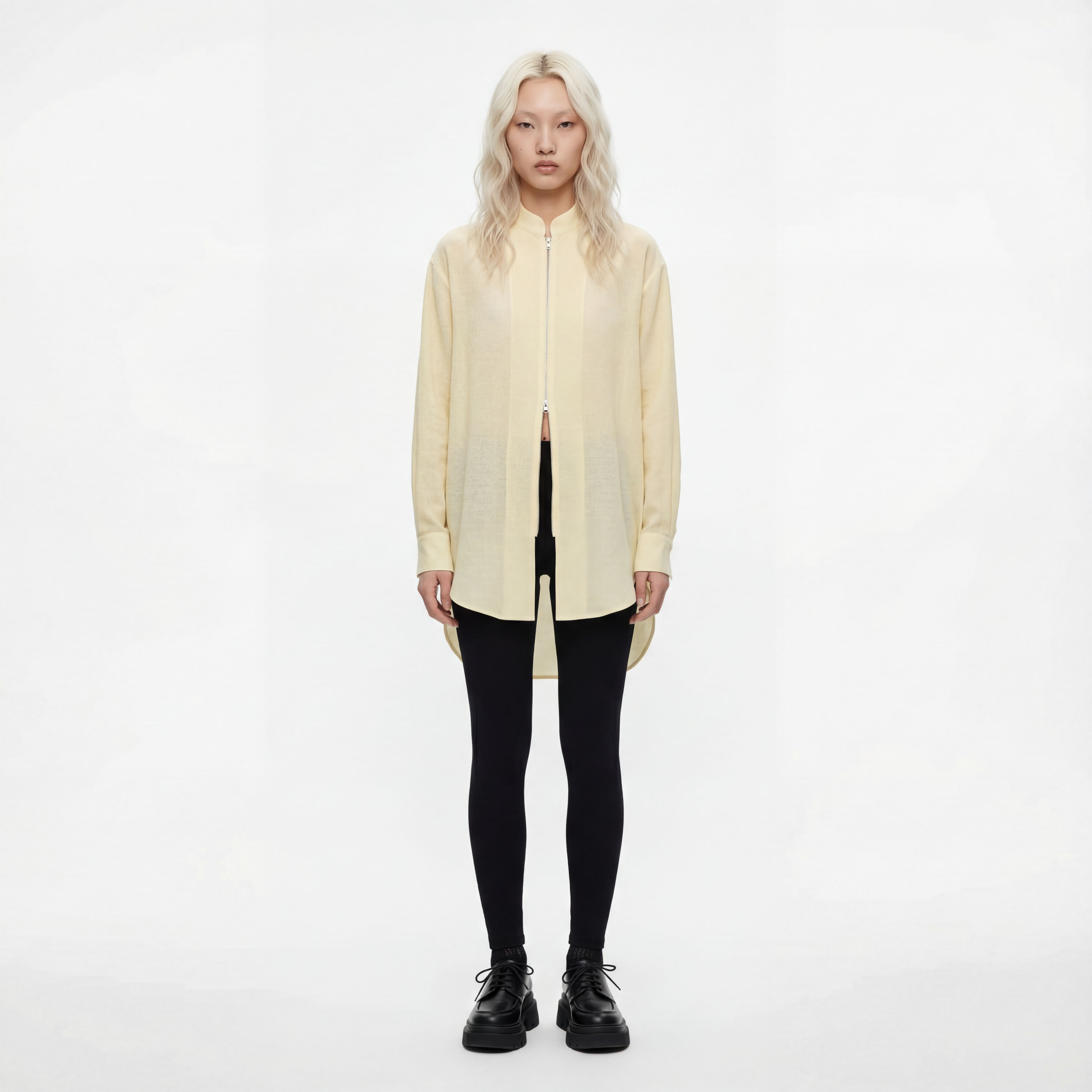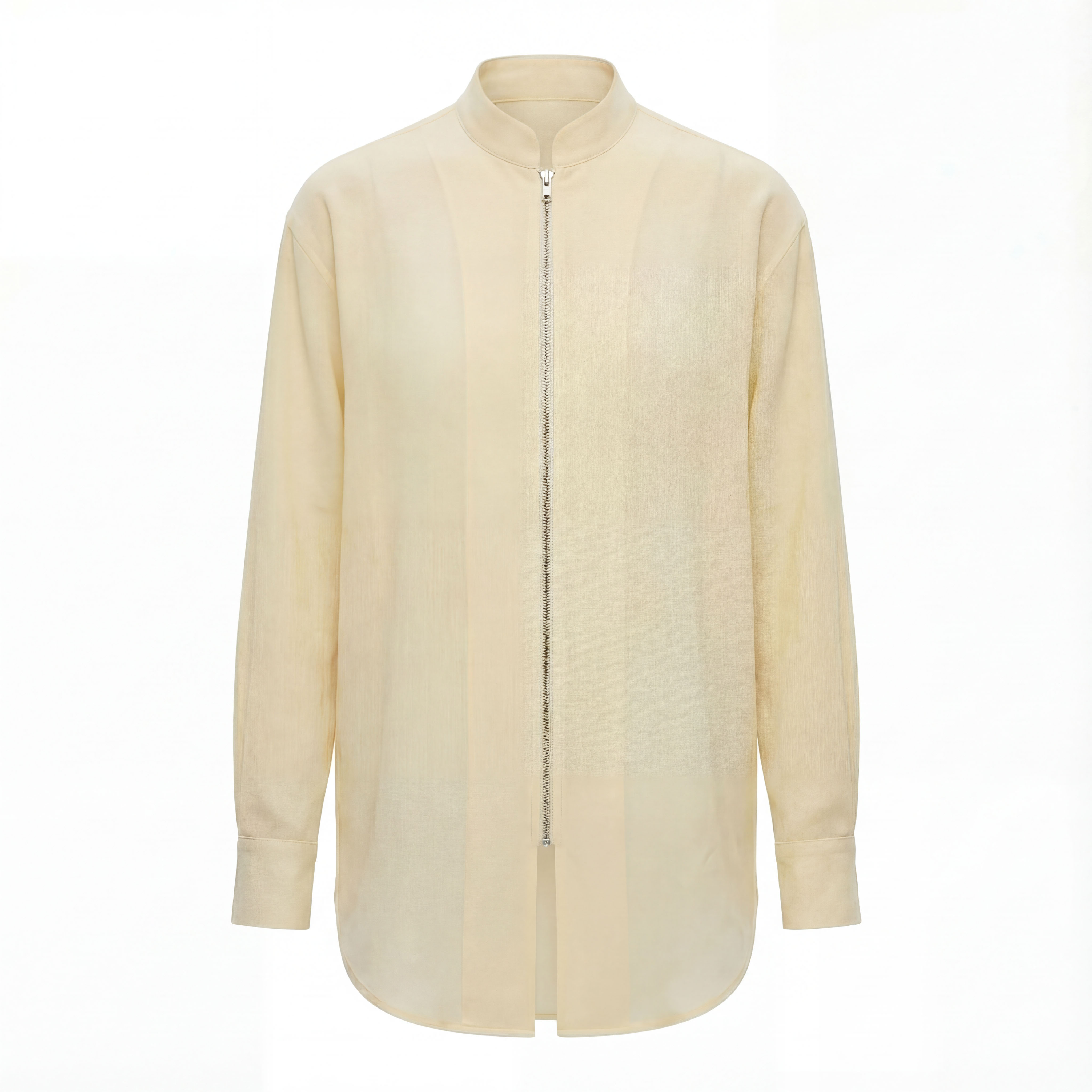 Лёгкая рубашка‑тунника на центральной металлической молнии из плотной, плательной текстурированной шерсти. Стойка, длинные рукава и закруглённый низ — лаконичный силуэт с мягкой драпировкой, цвет — тёплый кремовый.