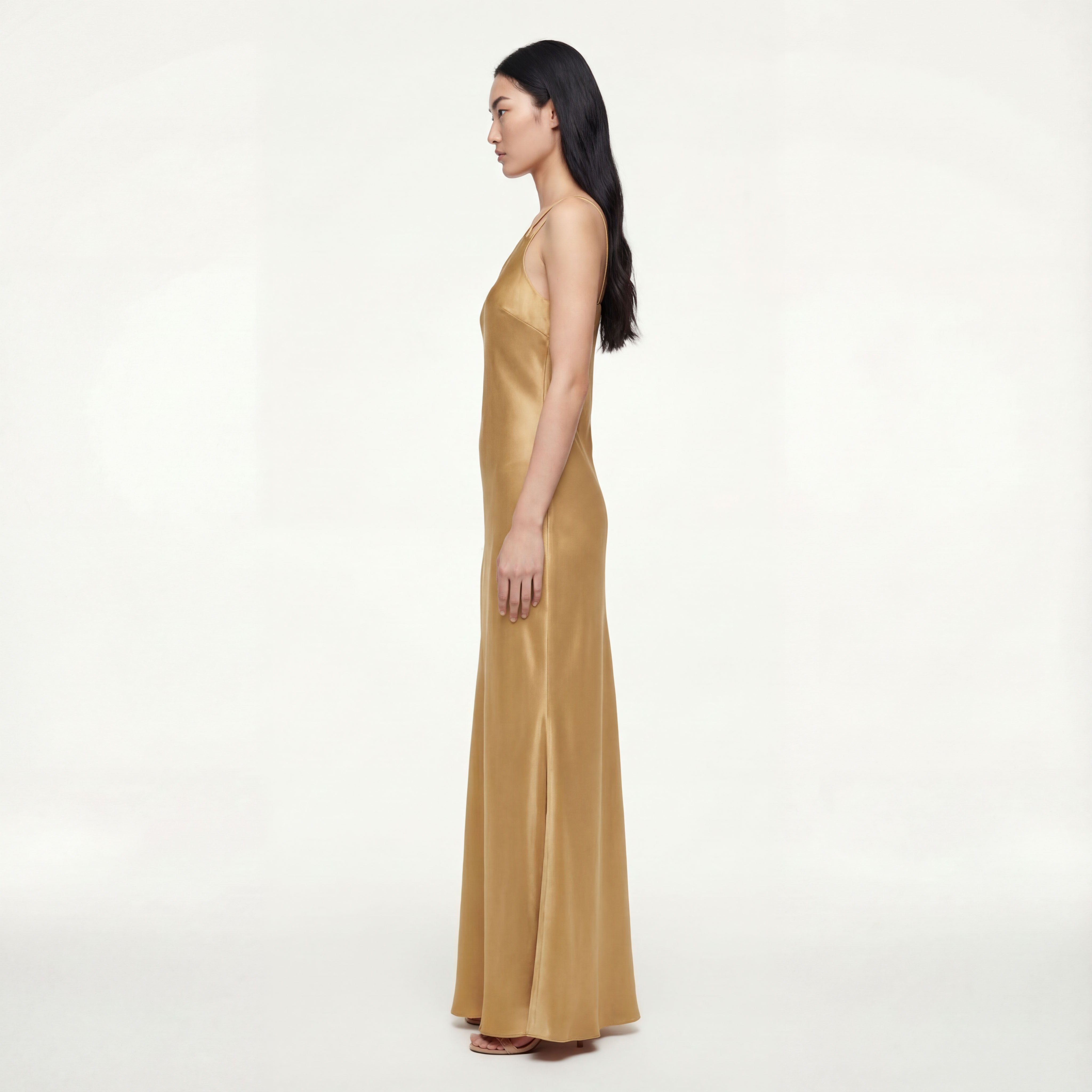 • Платье в пол из натурального дикого шёлка на тонких бретелях, покрой по косой — мягко драпируется по фигуре, слегка расходится к низу. Благородный золотистый блеск и минималистичный силуэт.
