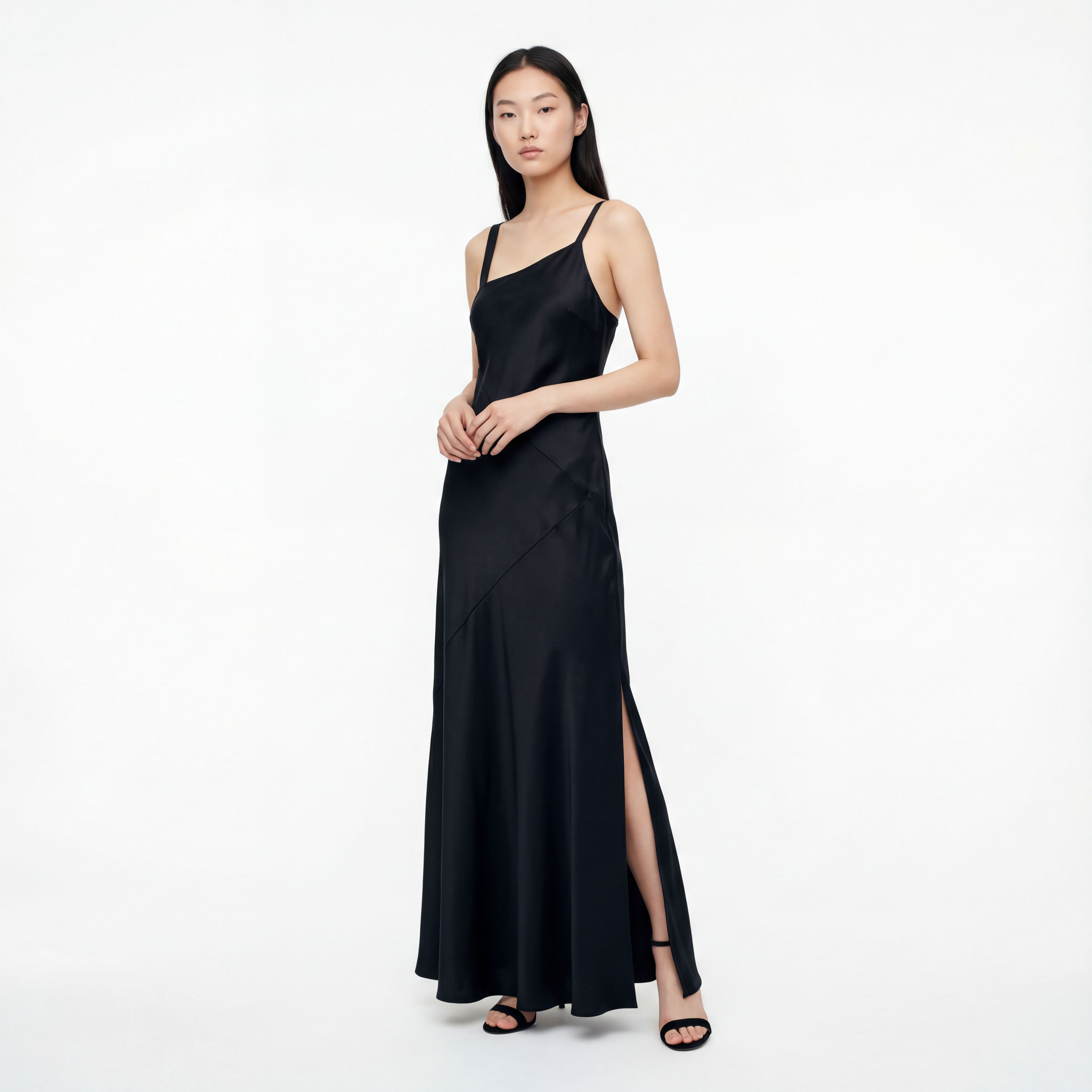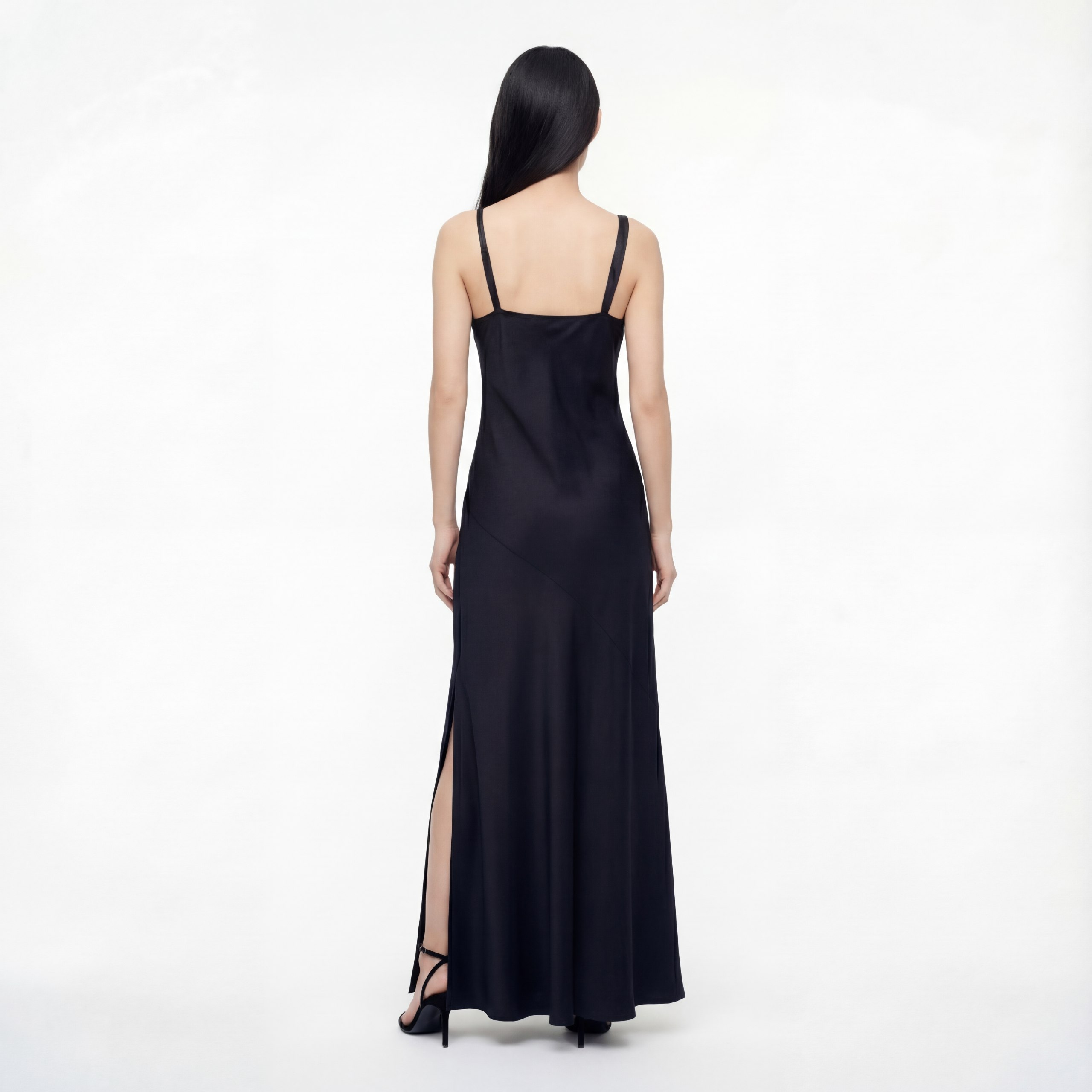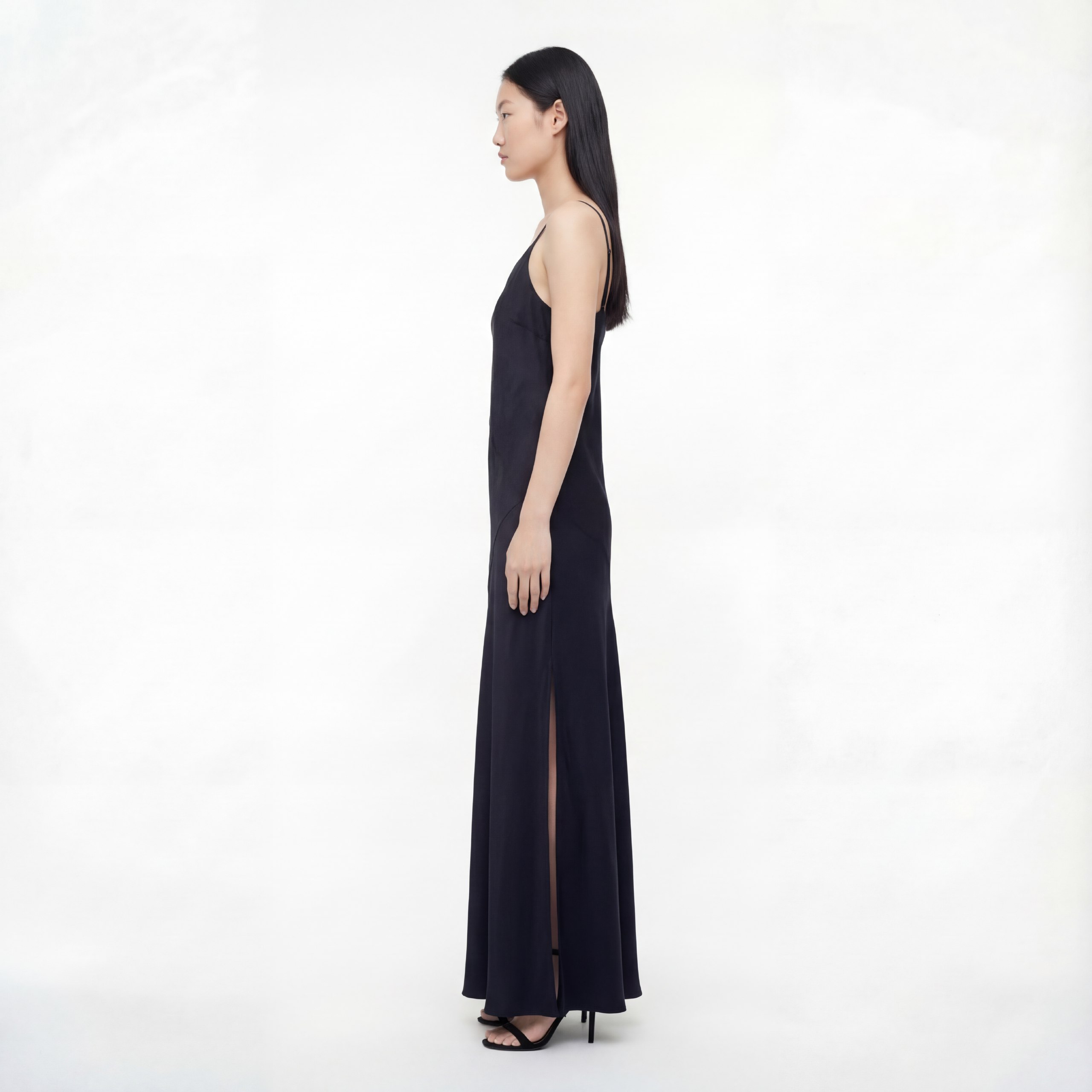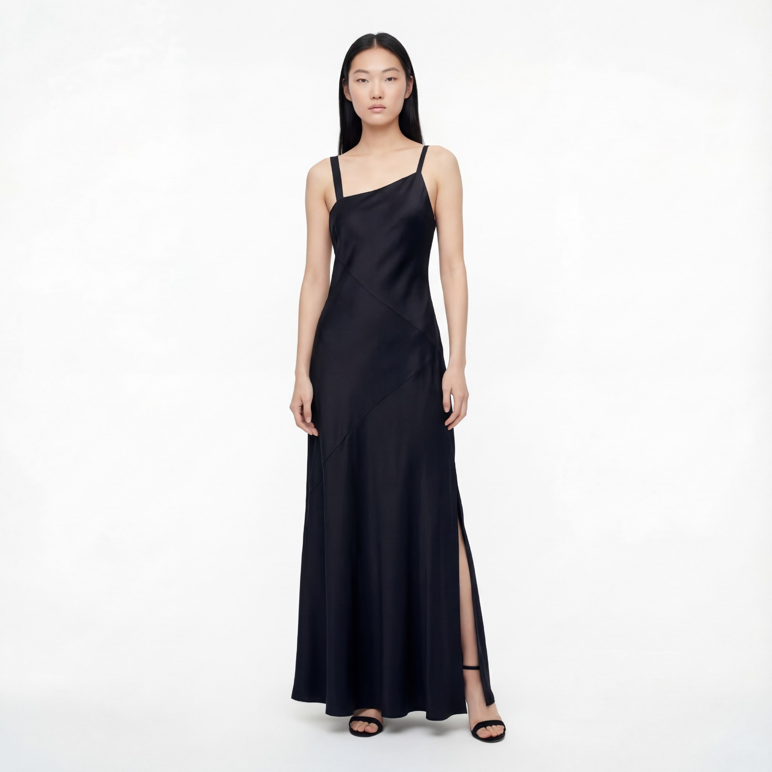 • Длинное платье из натурального шелка, покрой по косой, легкий блеск, асимметричный вырез с тонкими бретелями и аккуратным разрезом по бедру. Облегающий верх плавно переходит в расклешённый низ — элегантный минимализм для вечера.