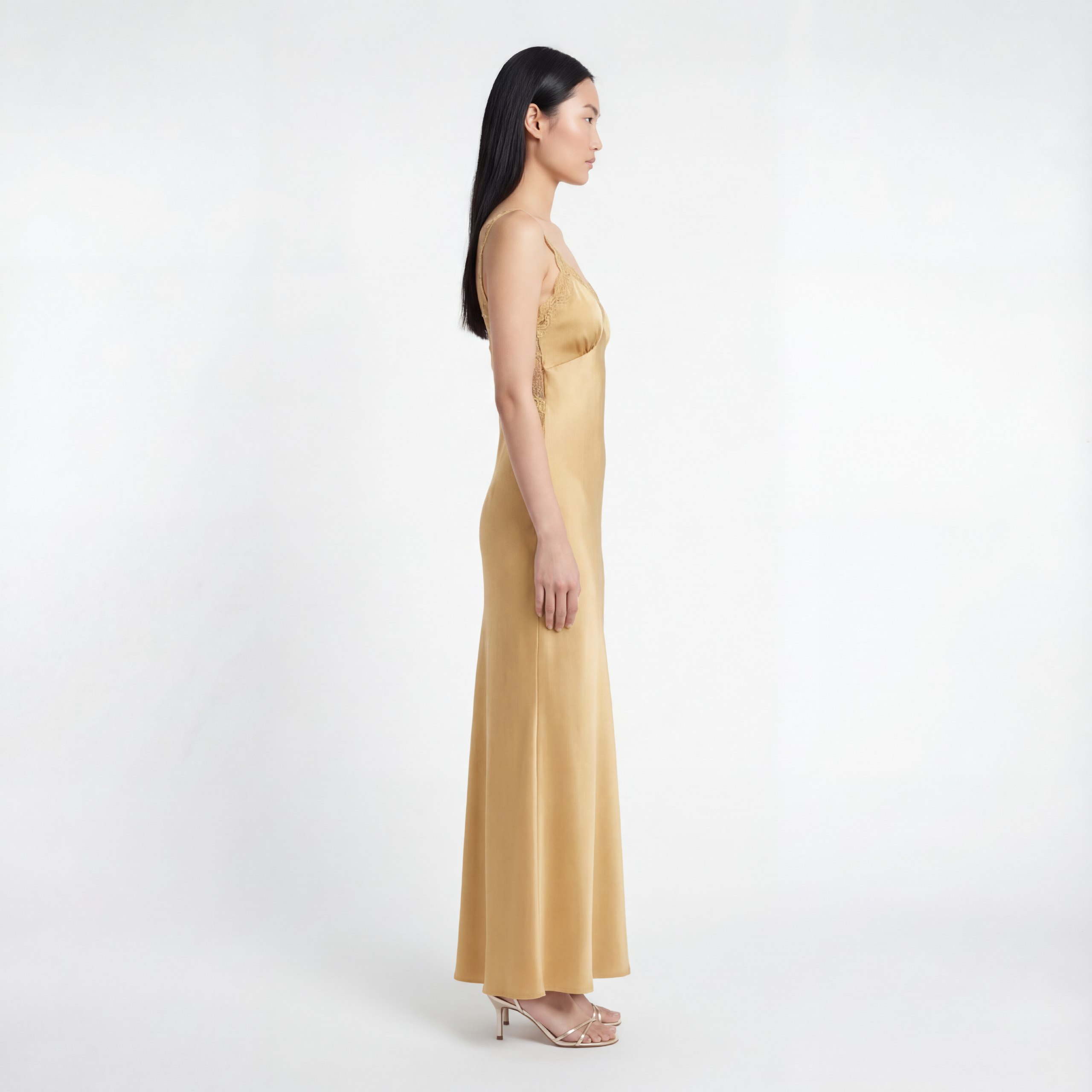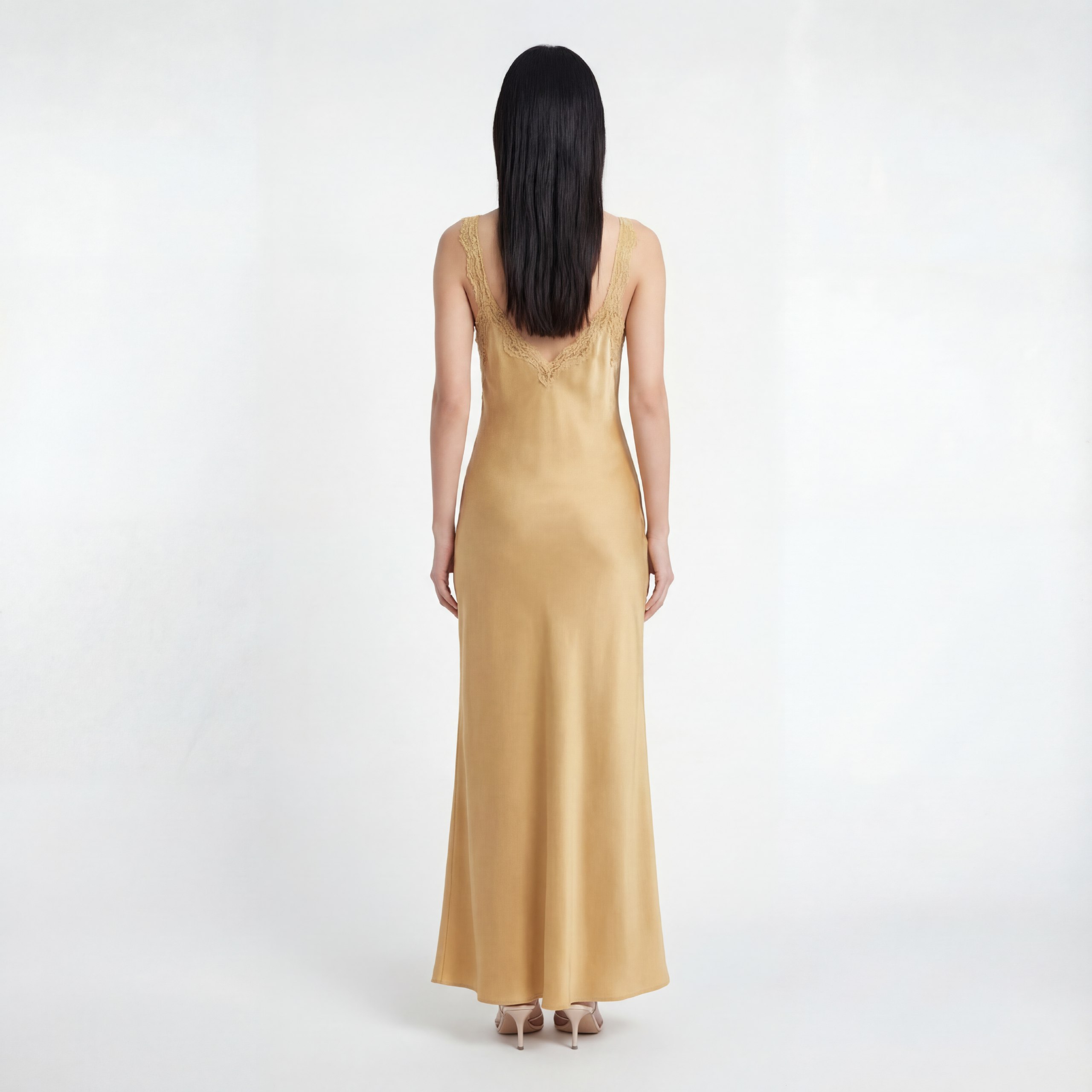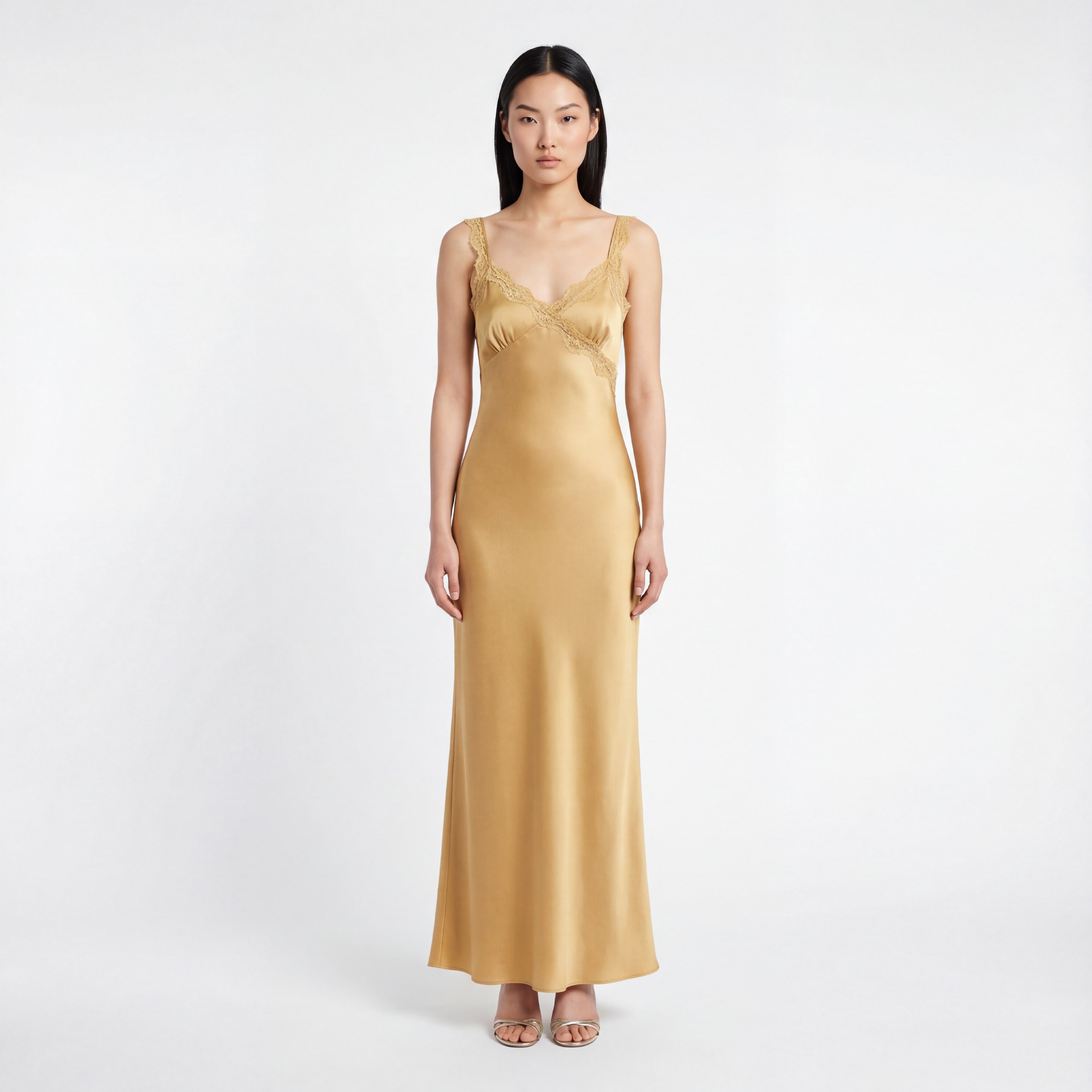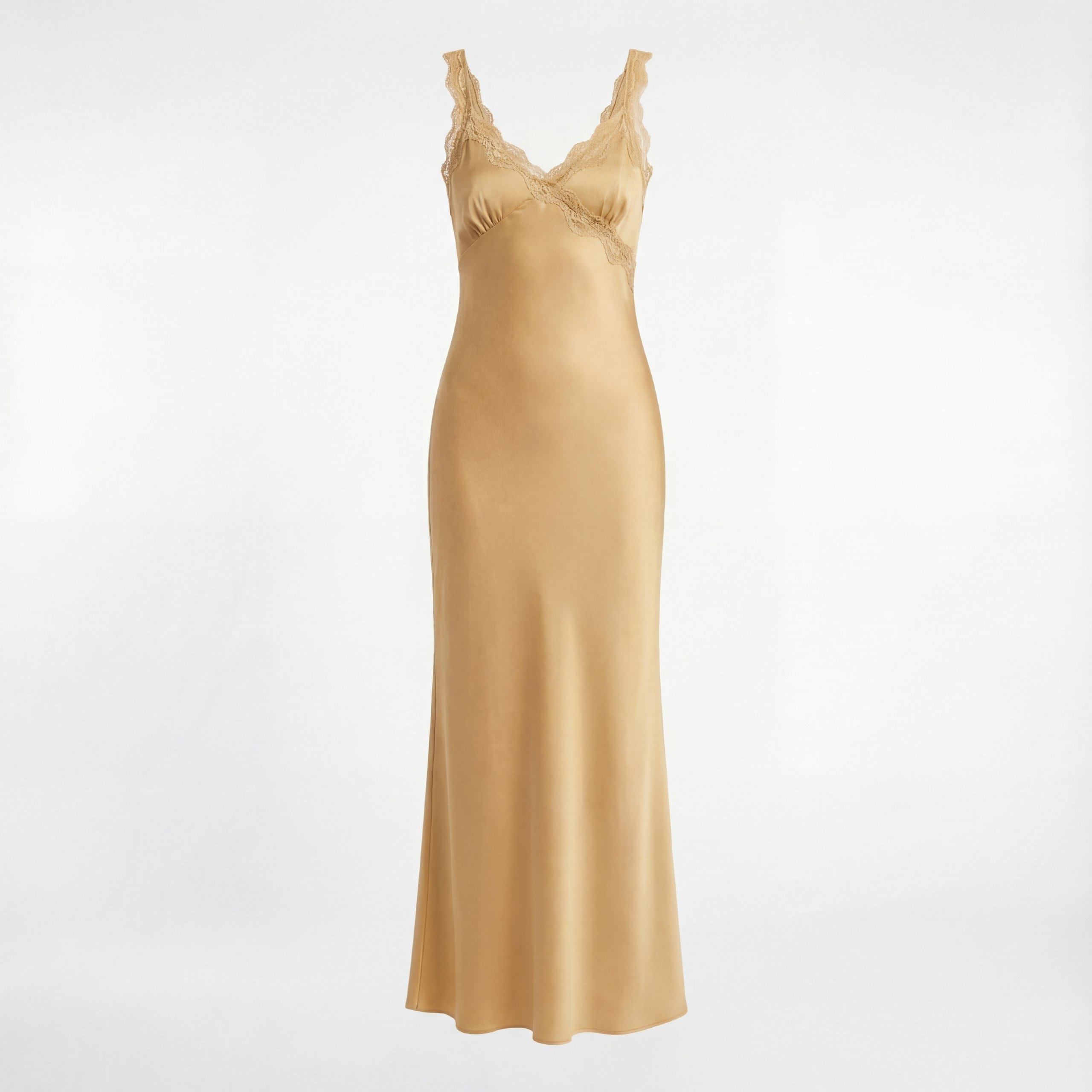 • Платье‑сорочка из натурального дикого шелка, покрой по косой для мягкого струящегося силуэта. Длинное макси, узкие бретели и изящная кружевная отделка в зоне декольте. Цвет — тёплый золотисто‑песочный, выглядит благородно и лёгко.