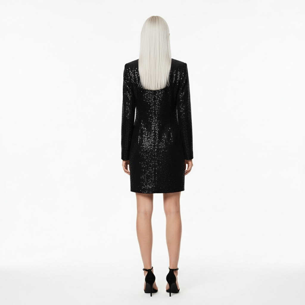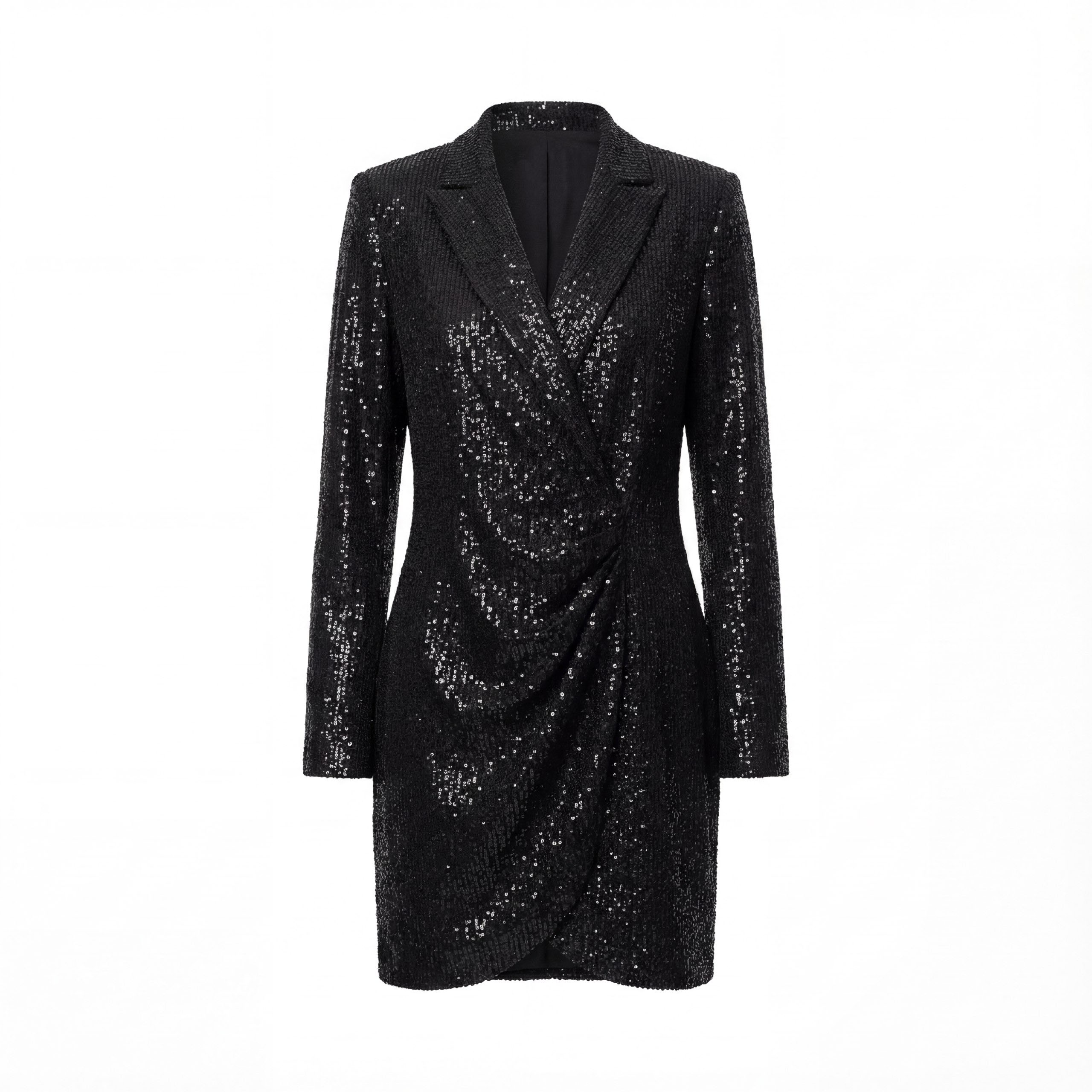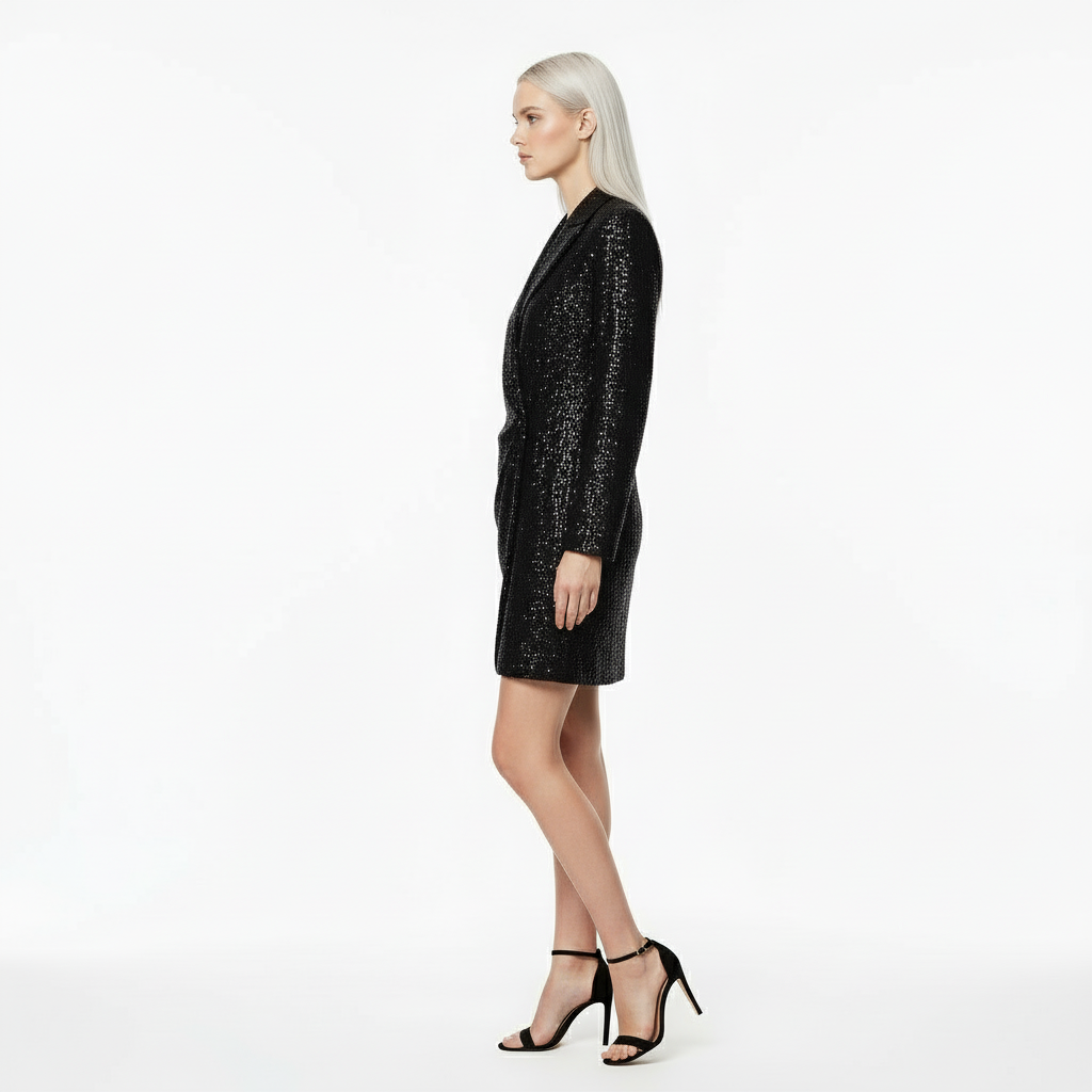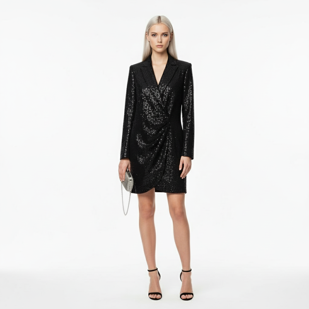 Черное платье‑пиджак с пайетками — приталенный мини‑силуэт с запахом и драпировкой спереди, полностью на подкладке. Эффектный вечерний вариант, который держит форму и красиво переливается в свете.