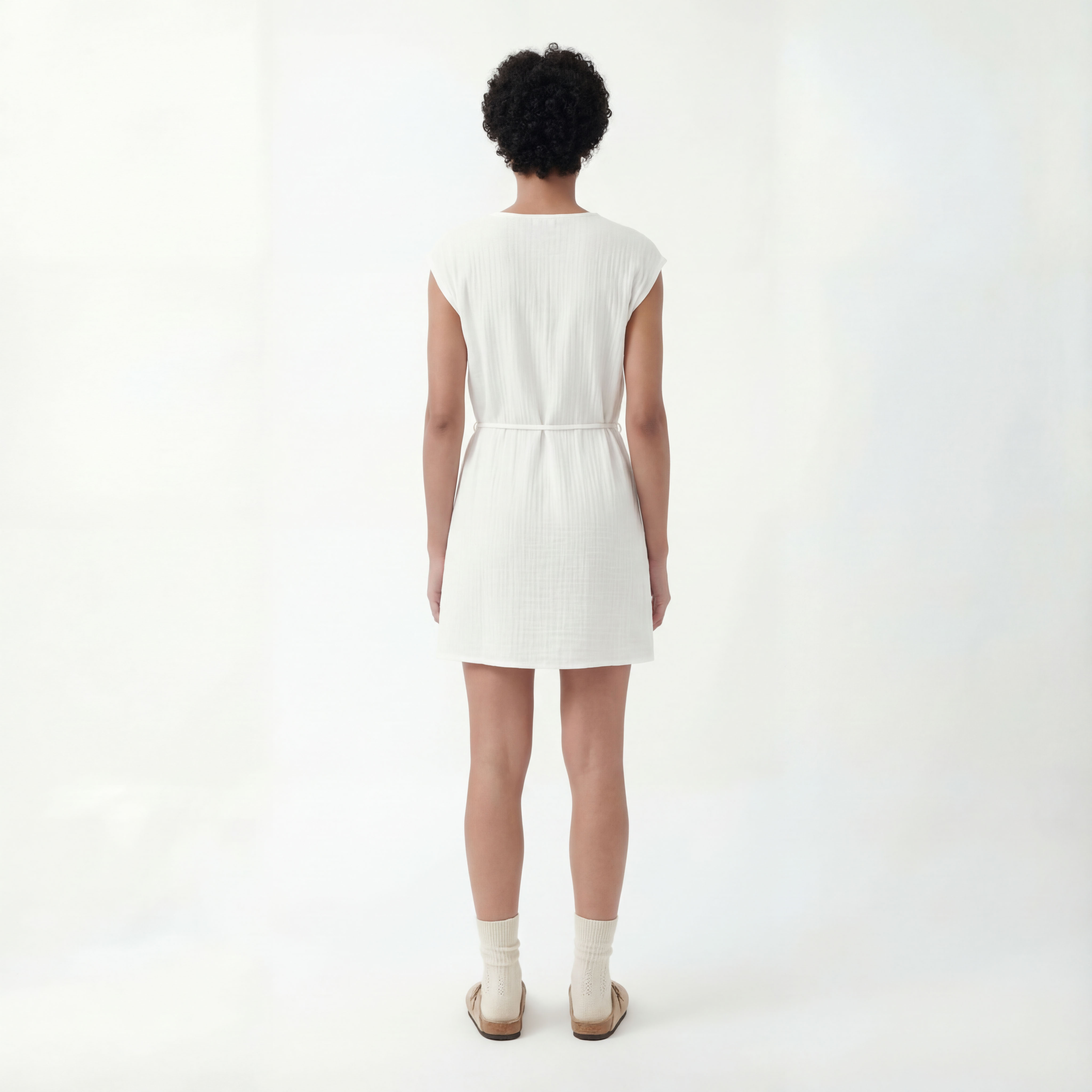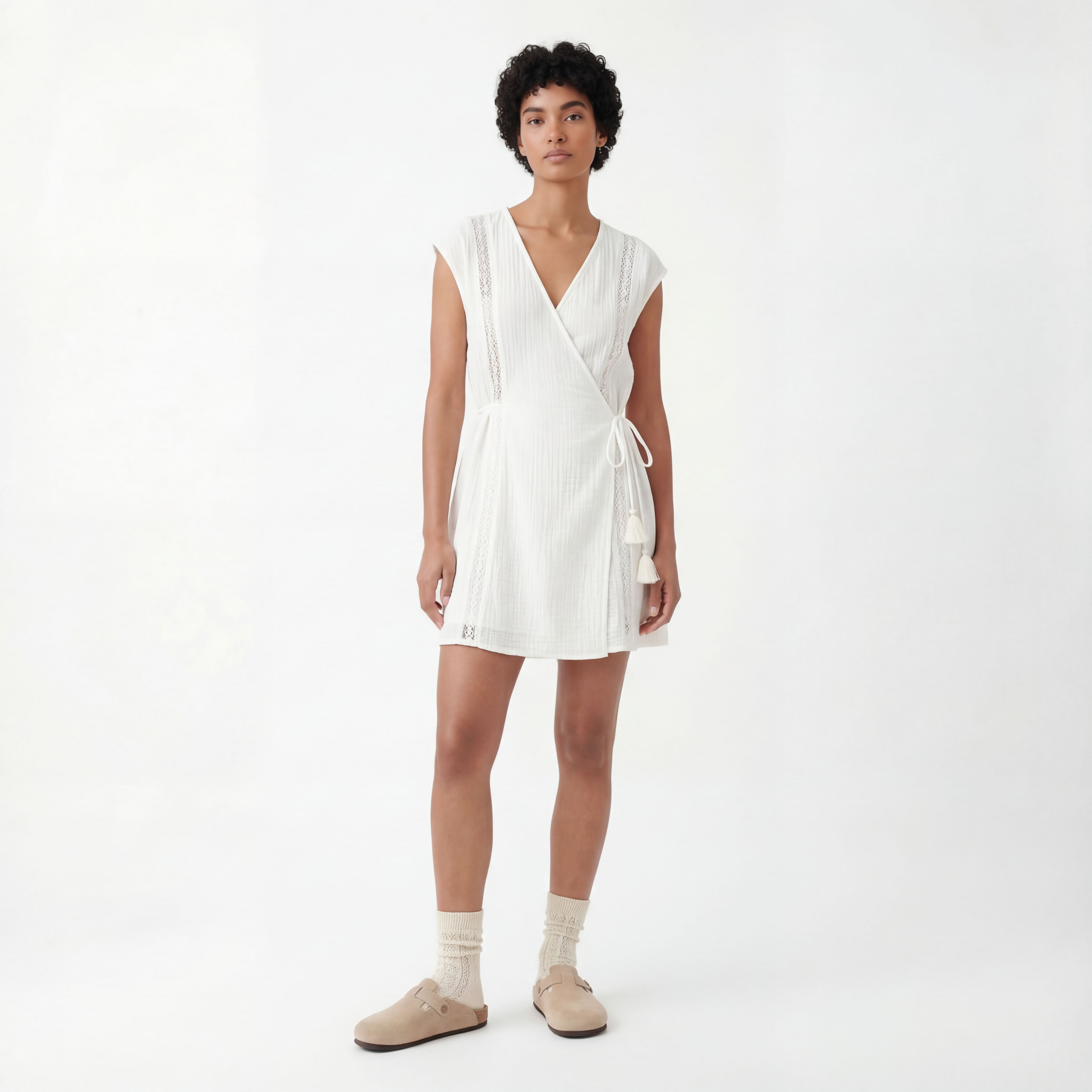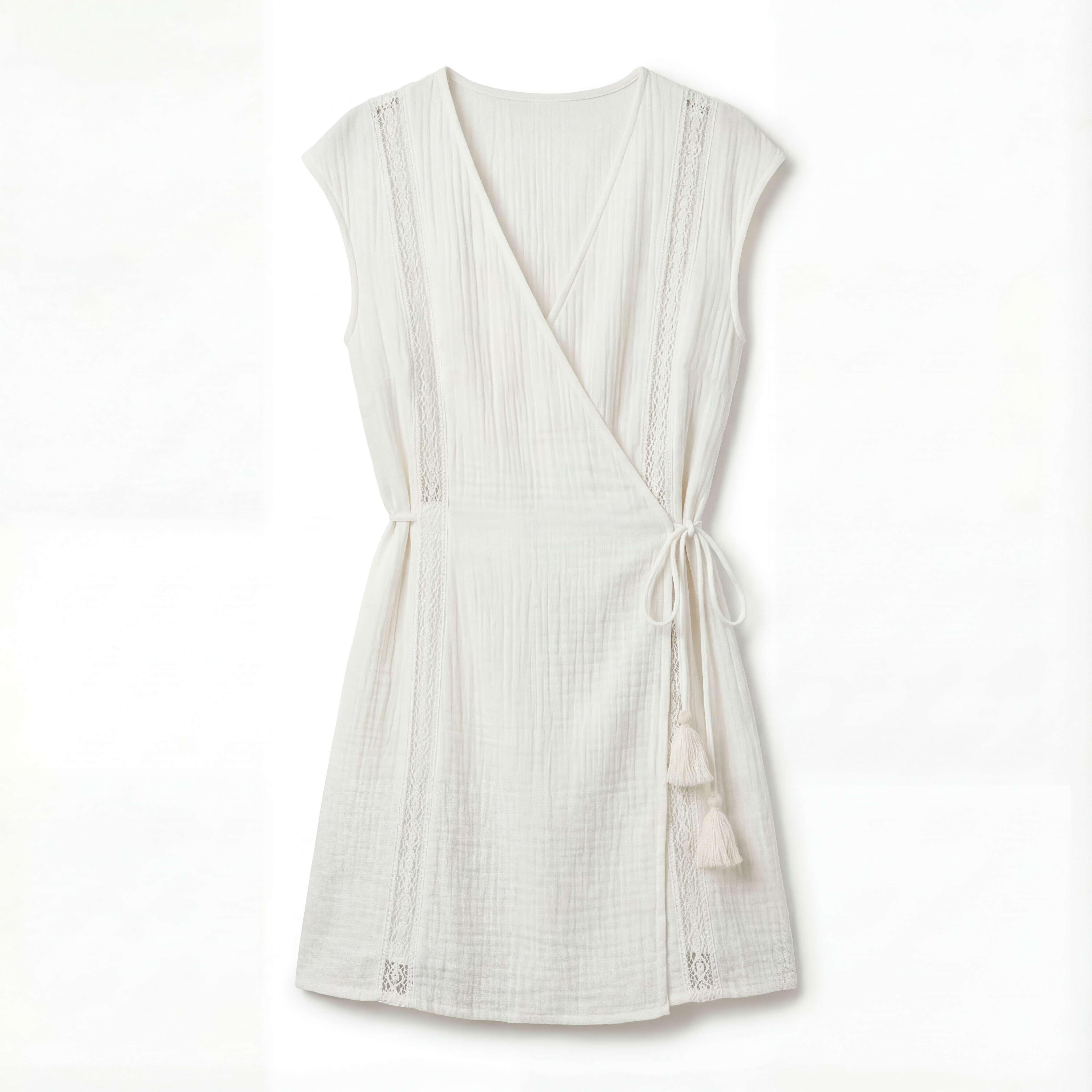 Лёгкое платье из натурального хлопка, мини-длина, запах с V‑образным вырезом и завязкой с кисточками. Текстурная полоска и короткие рукава создают непринуждённый, летний образ; свободный силуэт с возможностью подстроить талию.