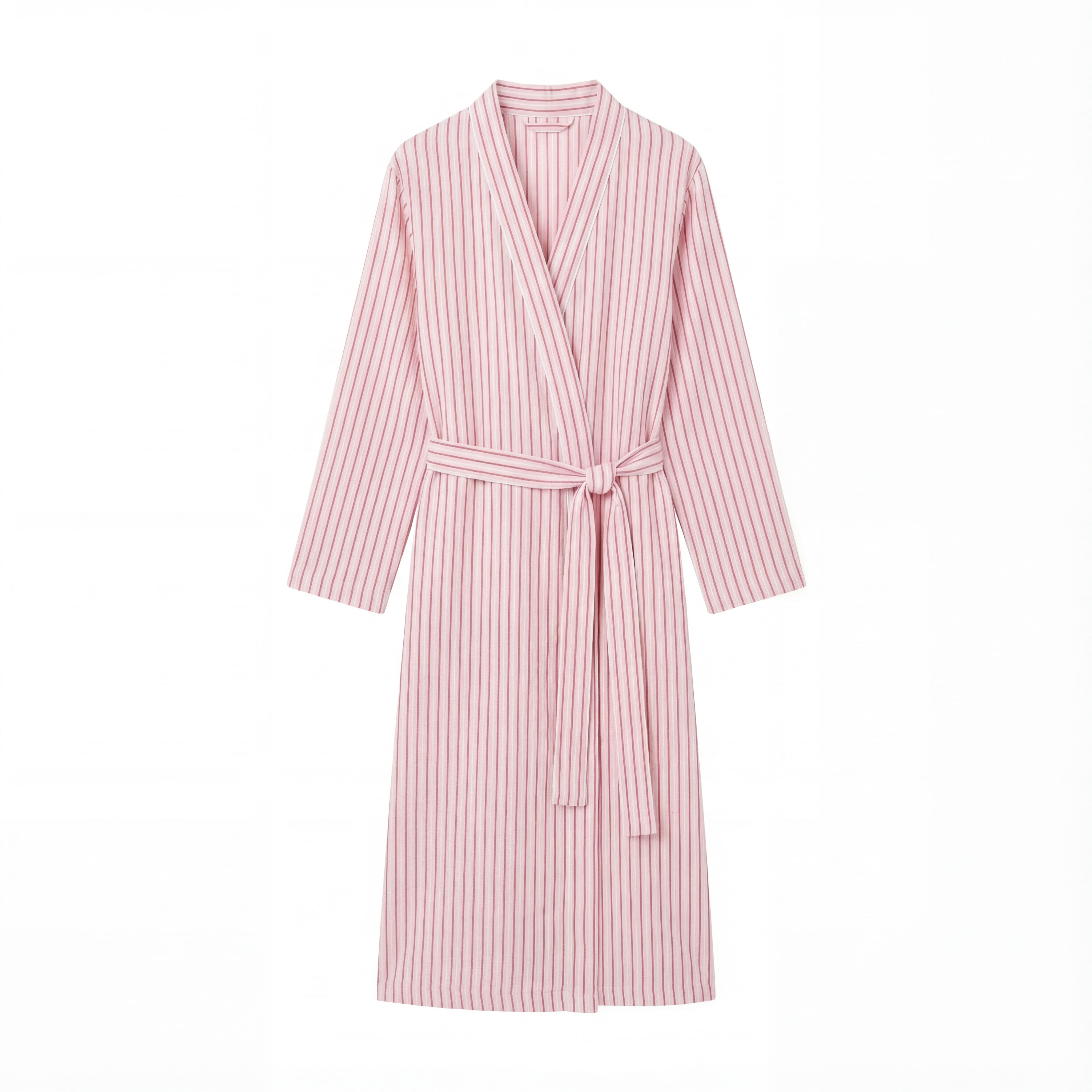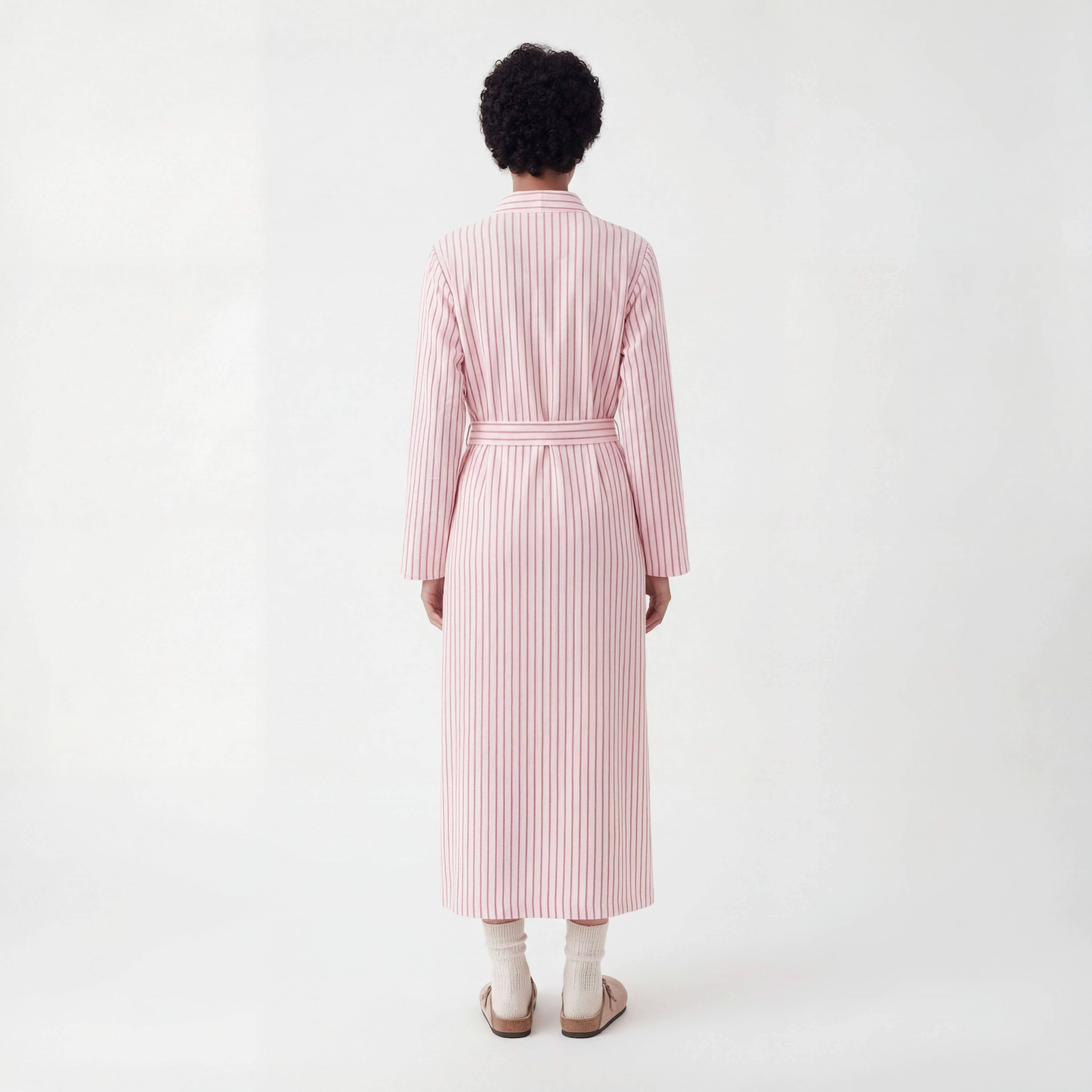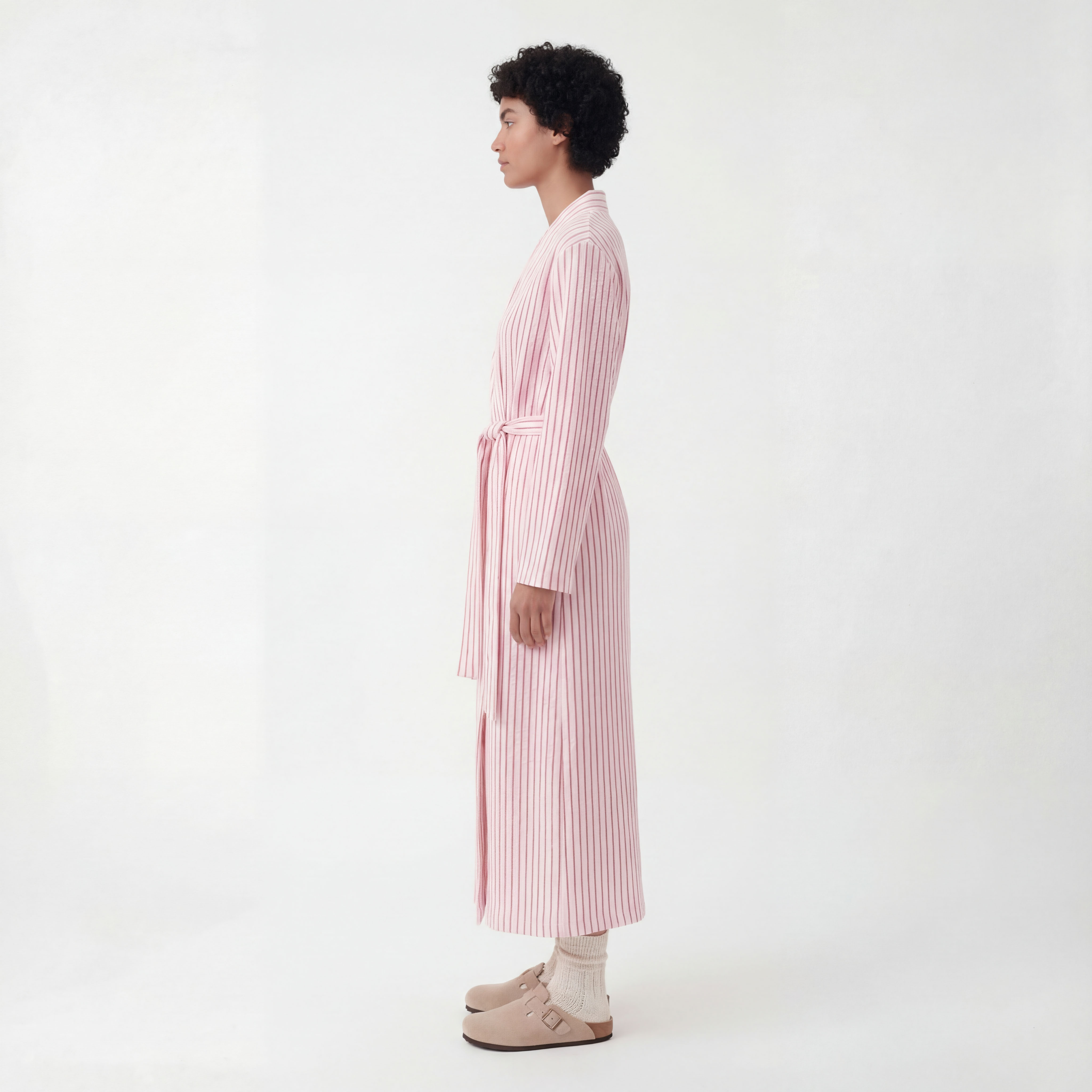 Лёгкий муслиновый халат пастельно-розового оттенка в тонкую вертикальную полоску. Длинный с запахом, поясом и боковыми карманами, свободный прямой крой и V‑воротник. Мягкий, дышащий и приятный к телу.