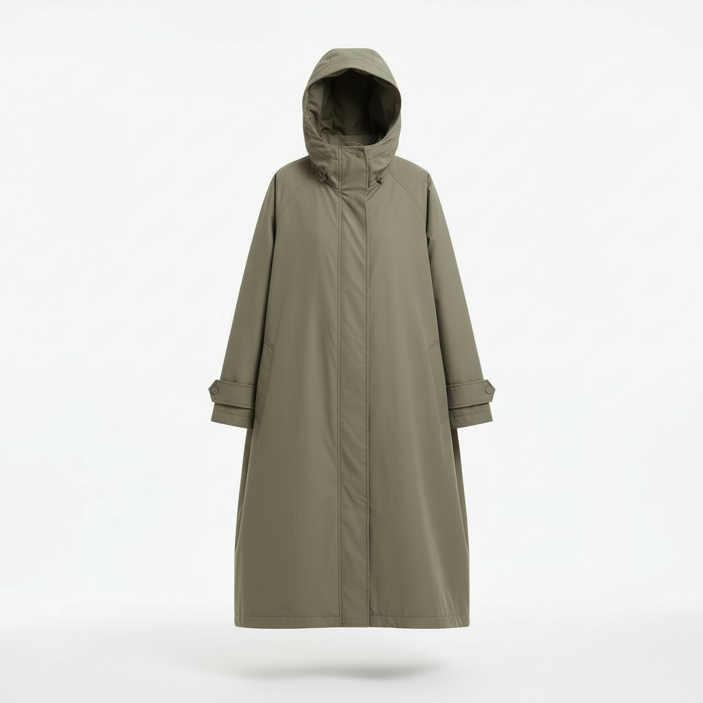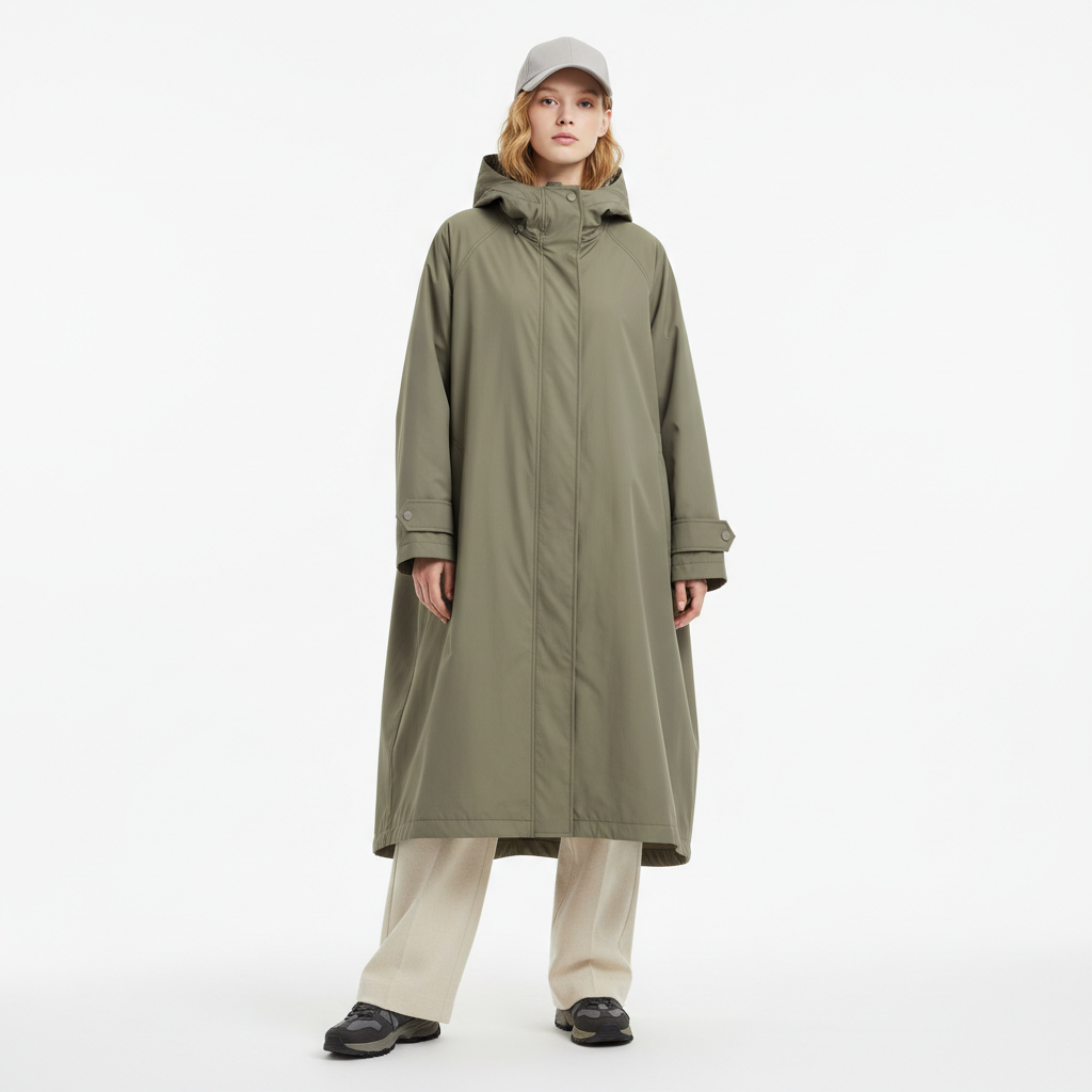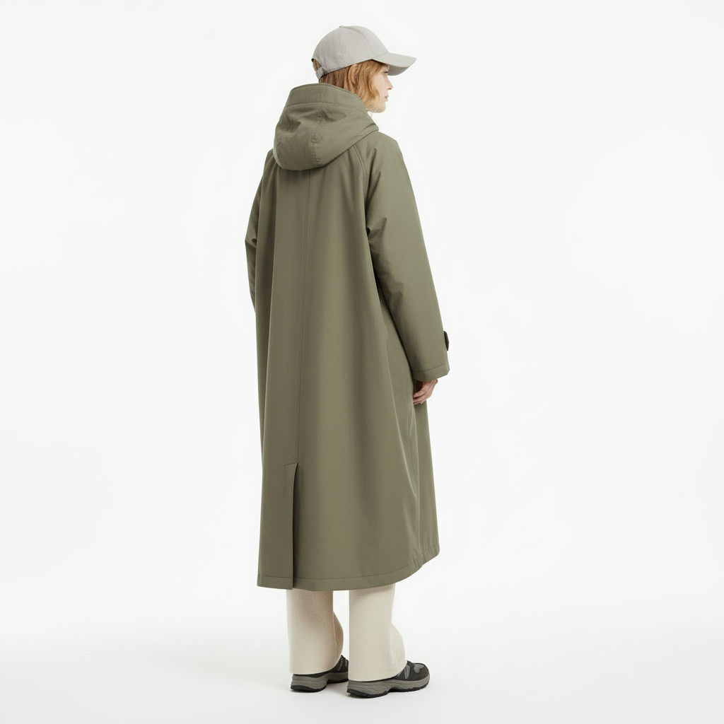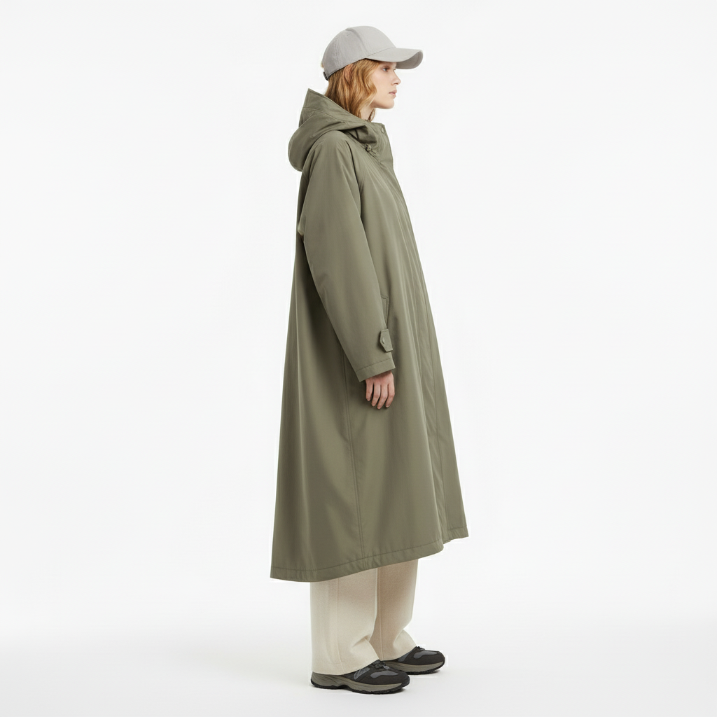 • Удлинённый тёплый плащ оверсайз в оливковом цвете, с капюшоном и скрытой центральной застёжкой. Свободный крой позволяет носить несколько слоёв; утеплённая подкладка обеспечивает комфорт до 0°C.