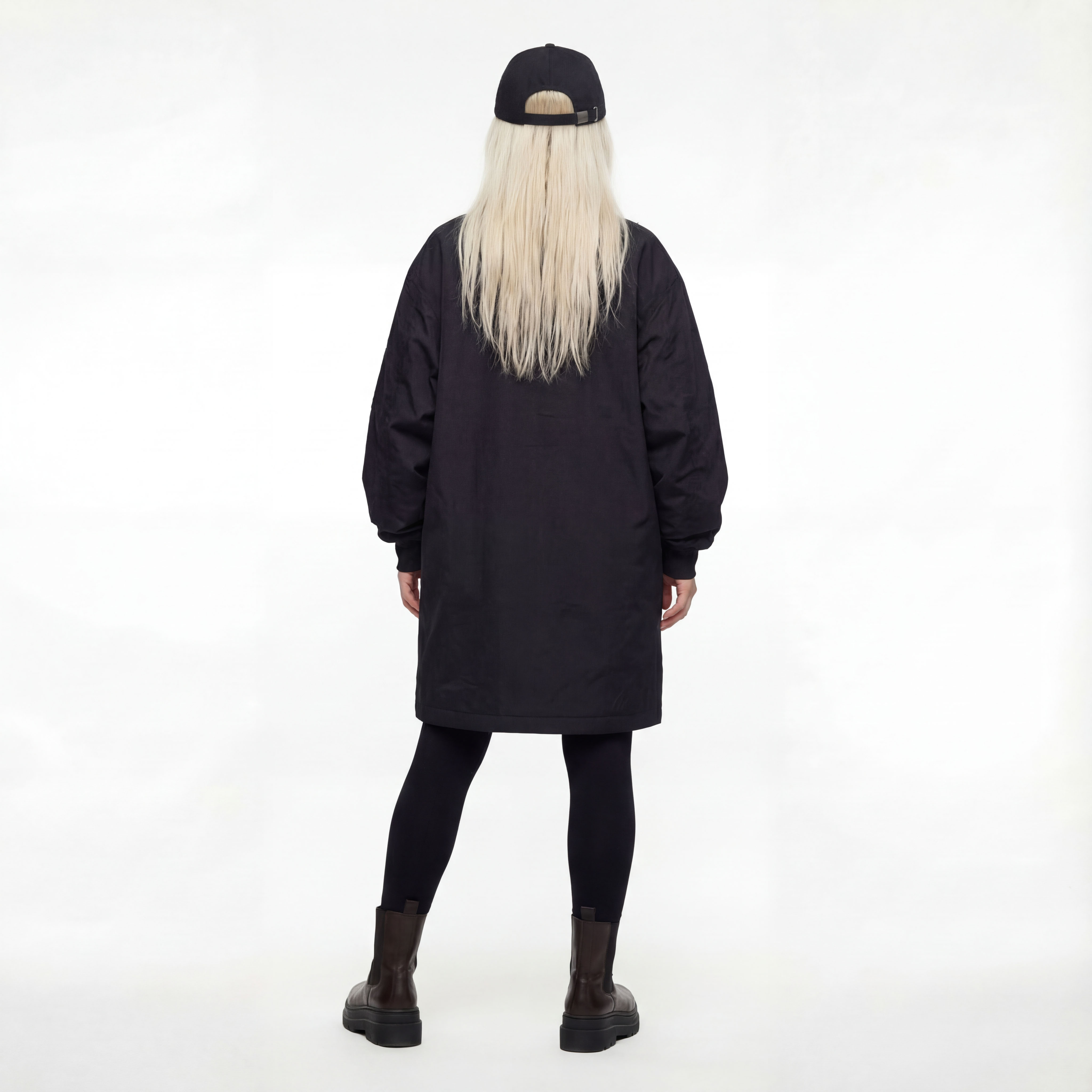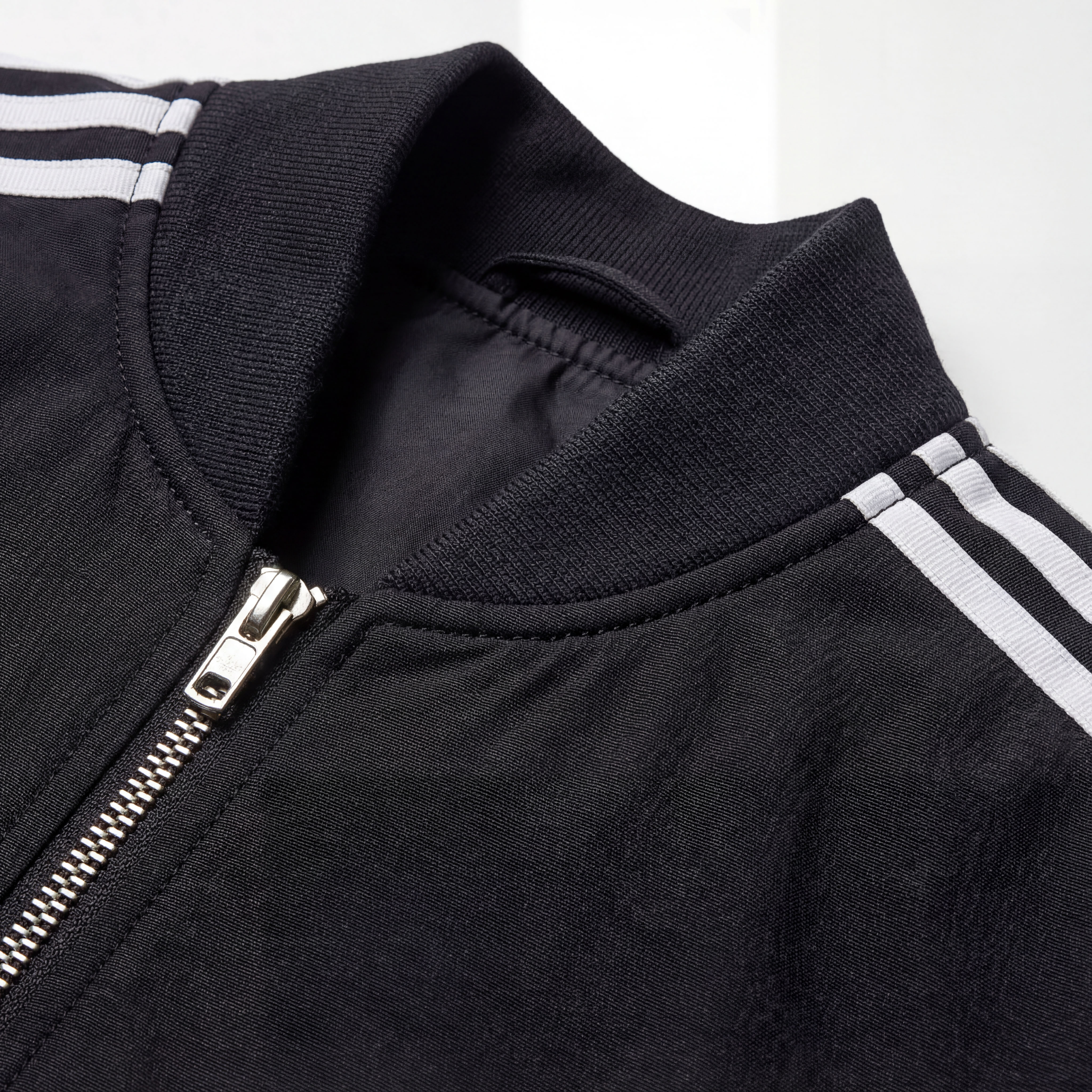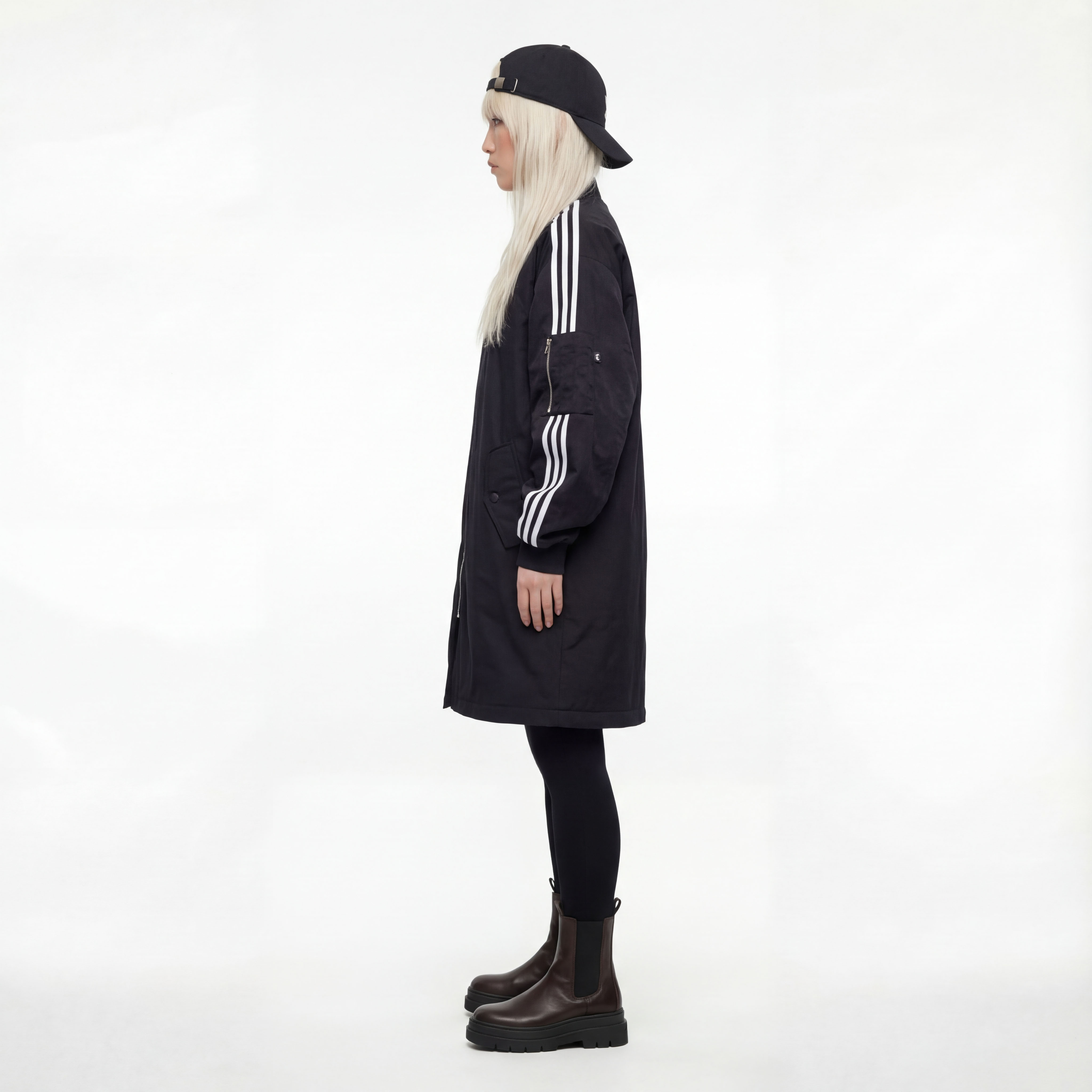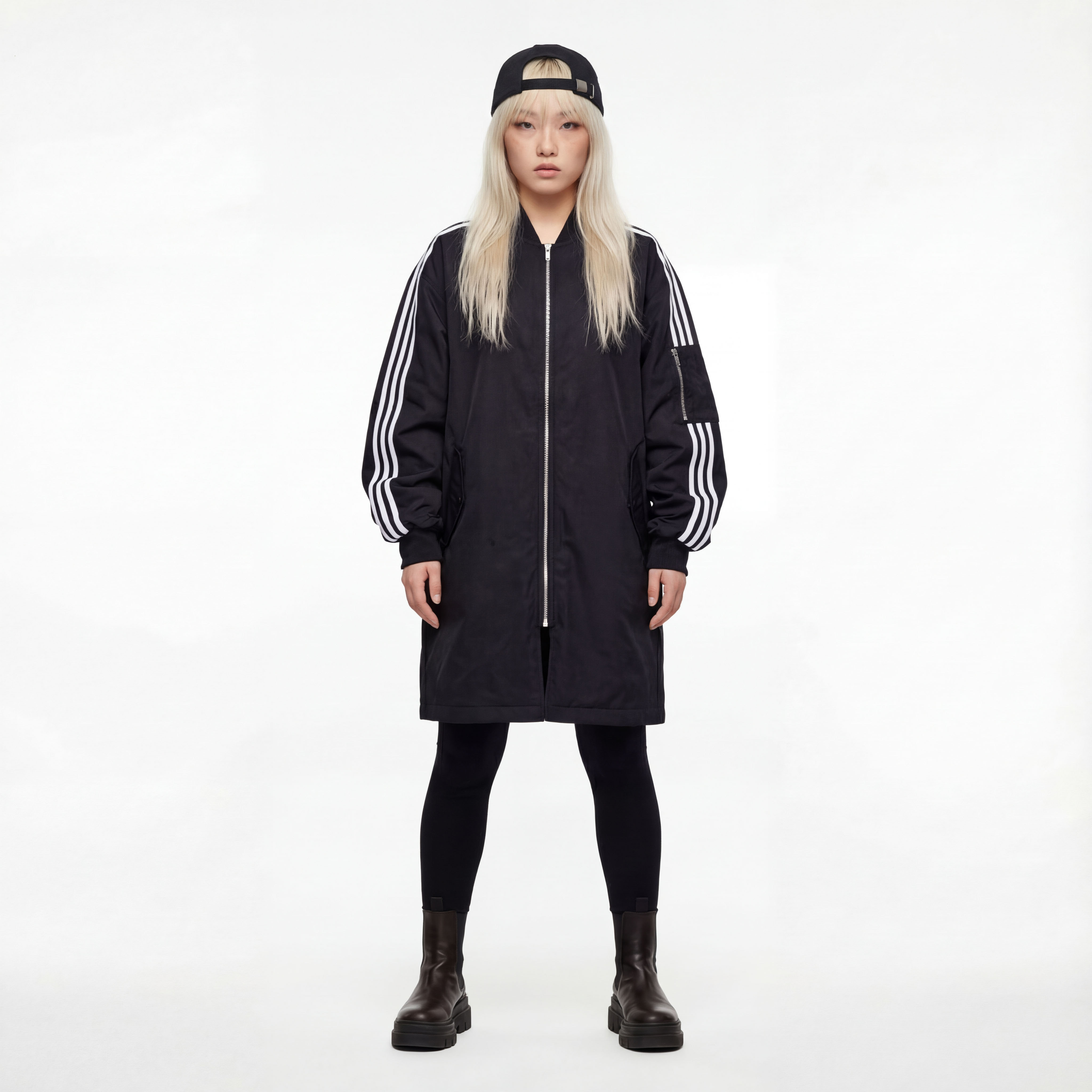 • Удлинённый тёплый бомбер чёрного цвета с контрастными белыми полосками на рукавах, центральной молнией, накладными карманами и эластичными манжетами.